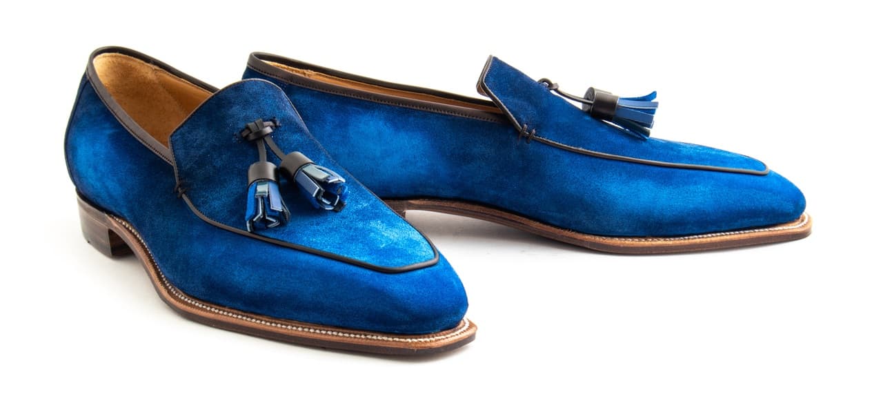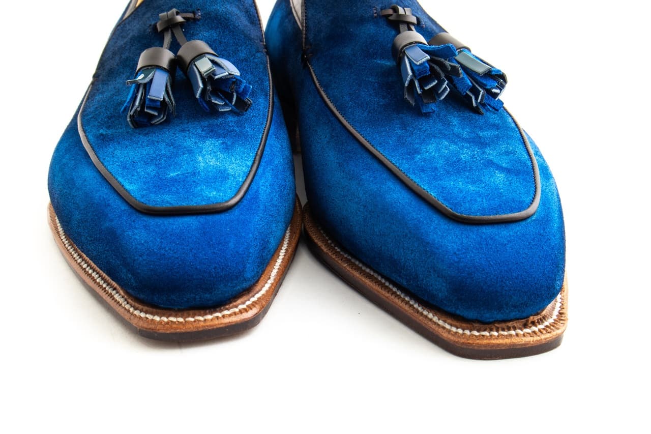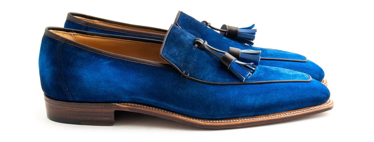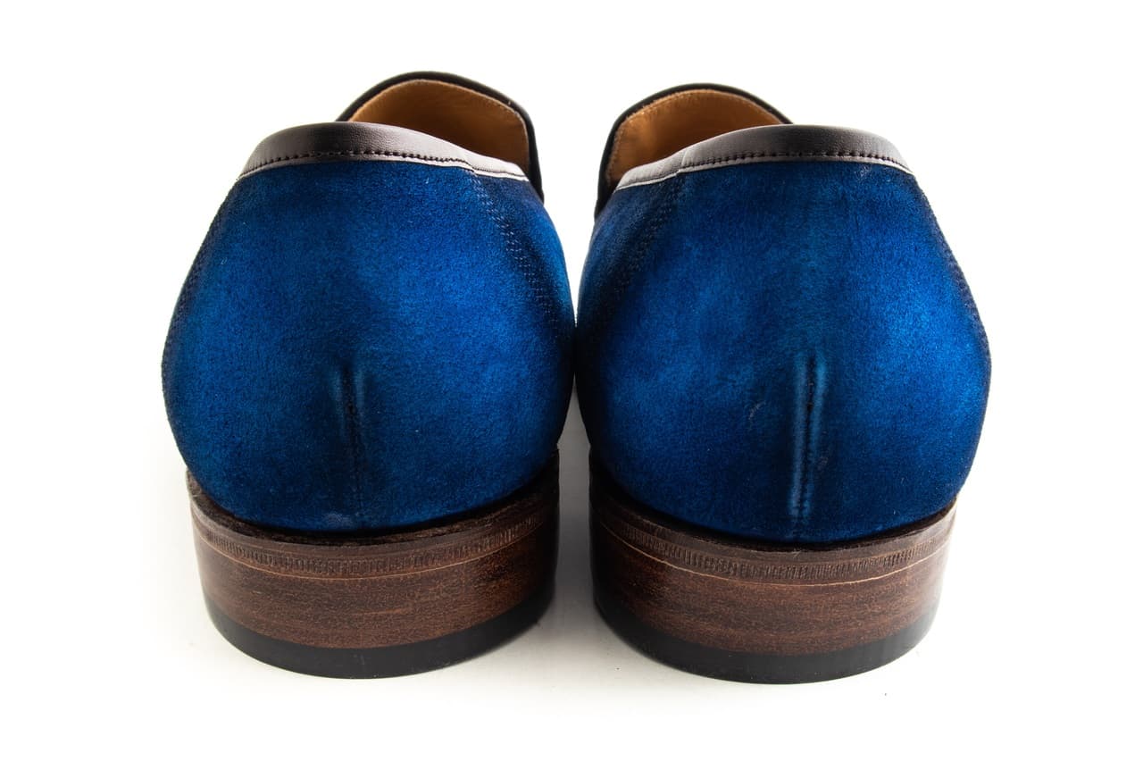 - Bright blue suede