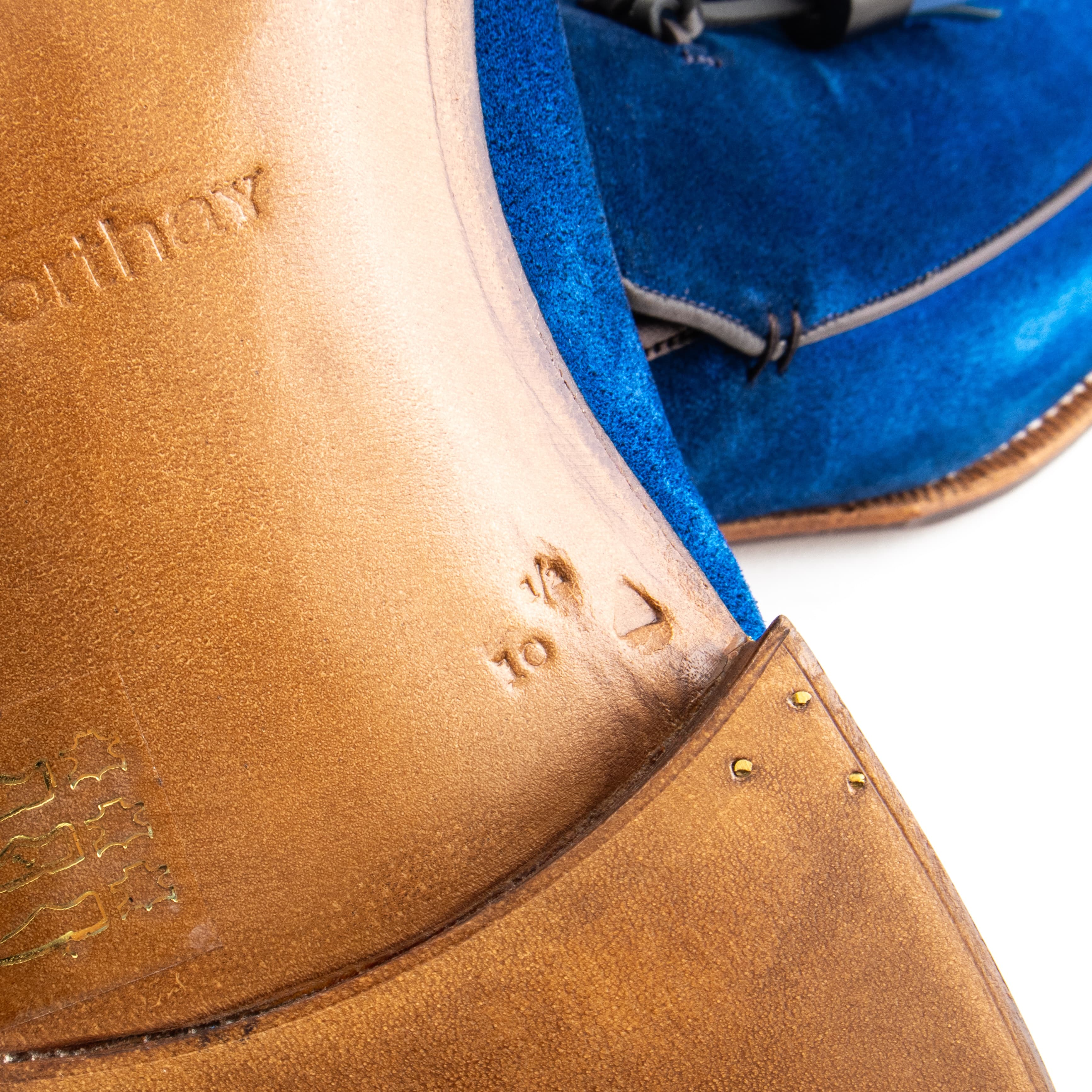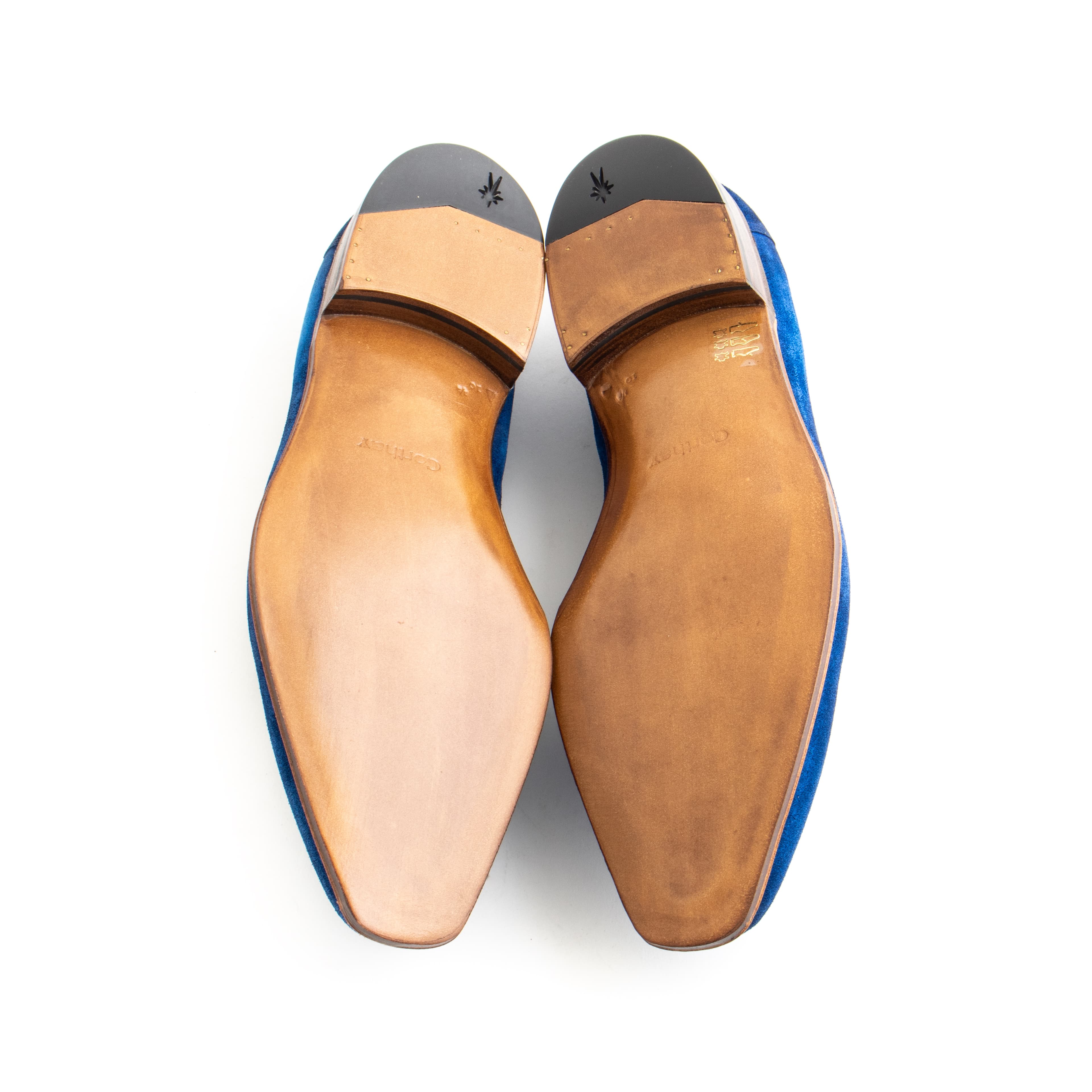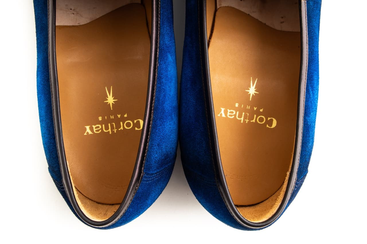 - Bright blue suede