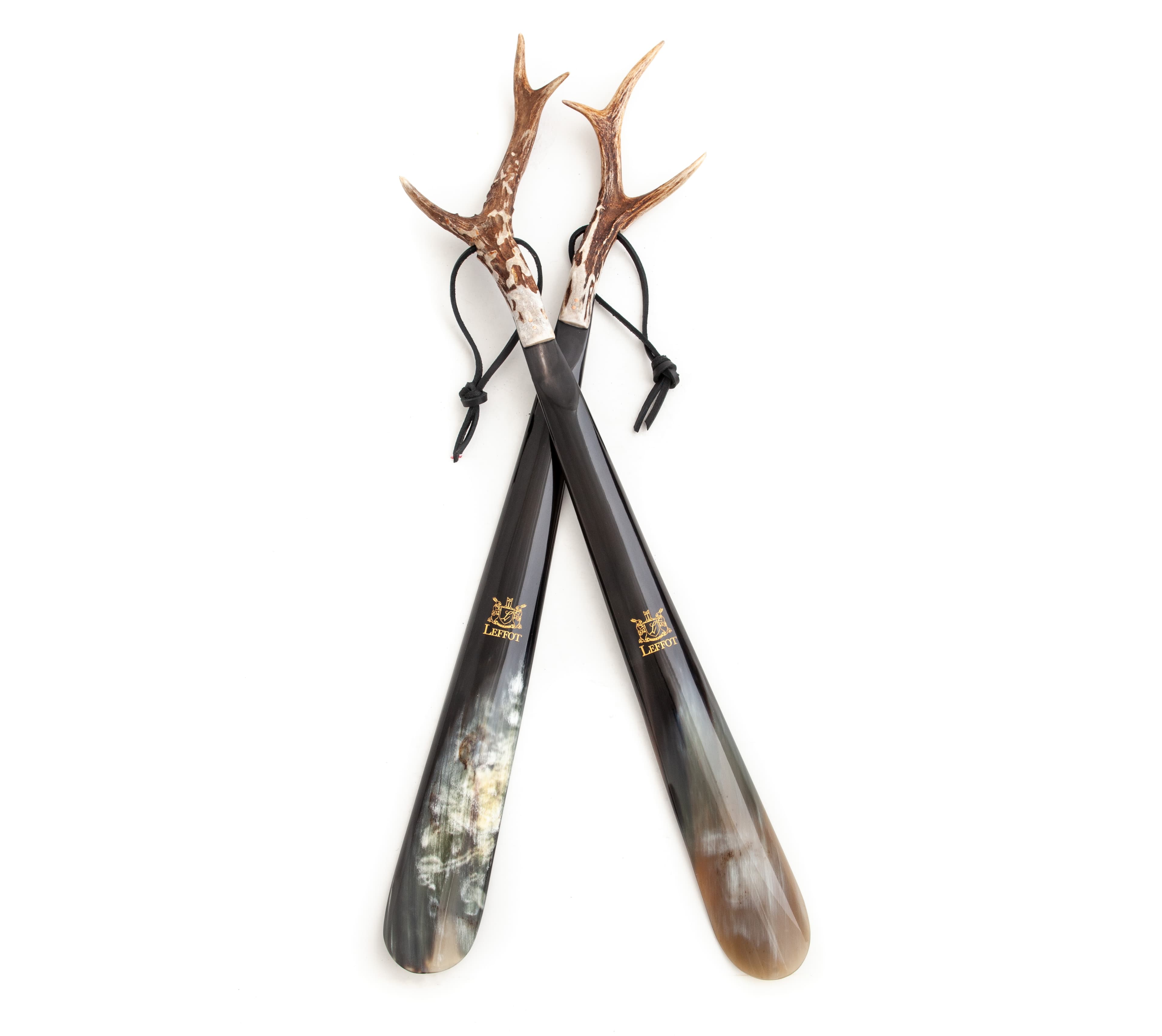 These beautiful shoehorns are both a one of a kind handcrafted gift and a practical tool that is essential for preserving the life of your shoes. Made from real oxenhorn and topped with deer antler, each Abbeyhorn has its own unique, natural pattern.