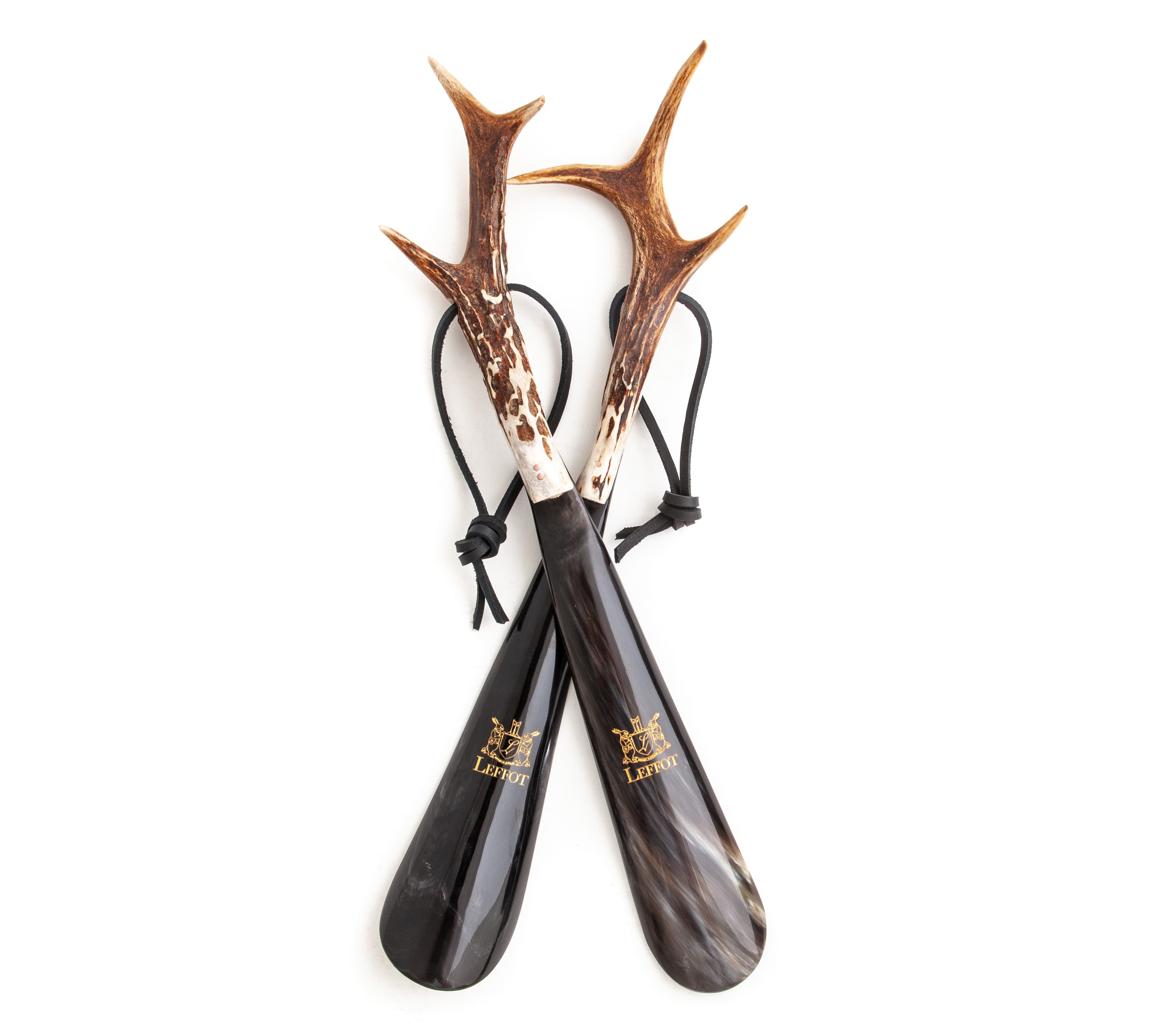 These beautiful shoehorns are both a one of a kind handcrafted gift and a practical tool that is essential for preserving the life of your shoes. Made from real oxenhorn and topped with deer antler, each Abbeyhorn has its own unique, natural pattern.