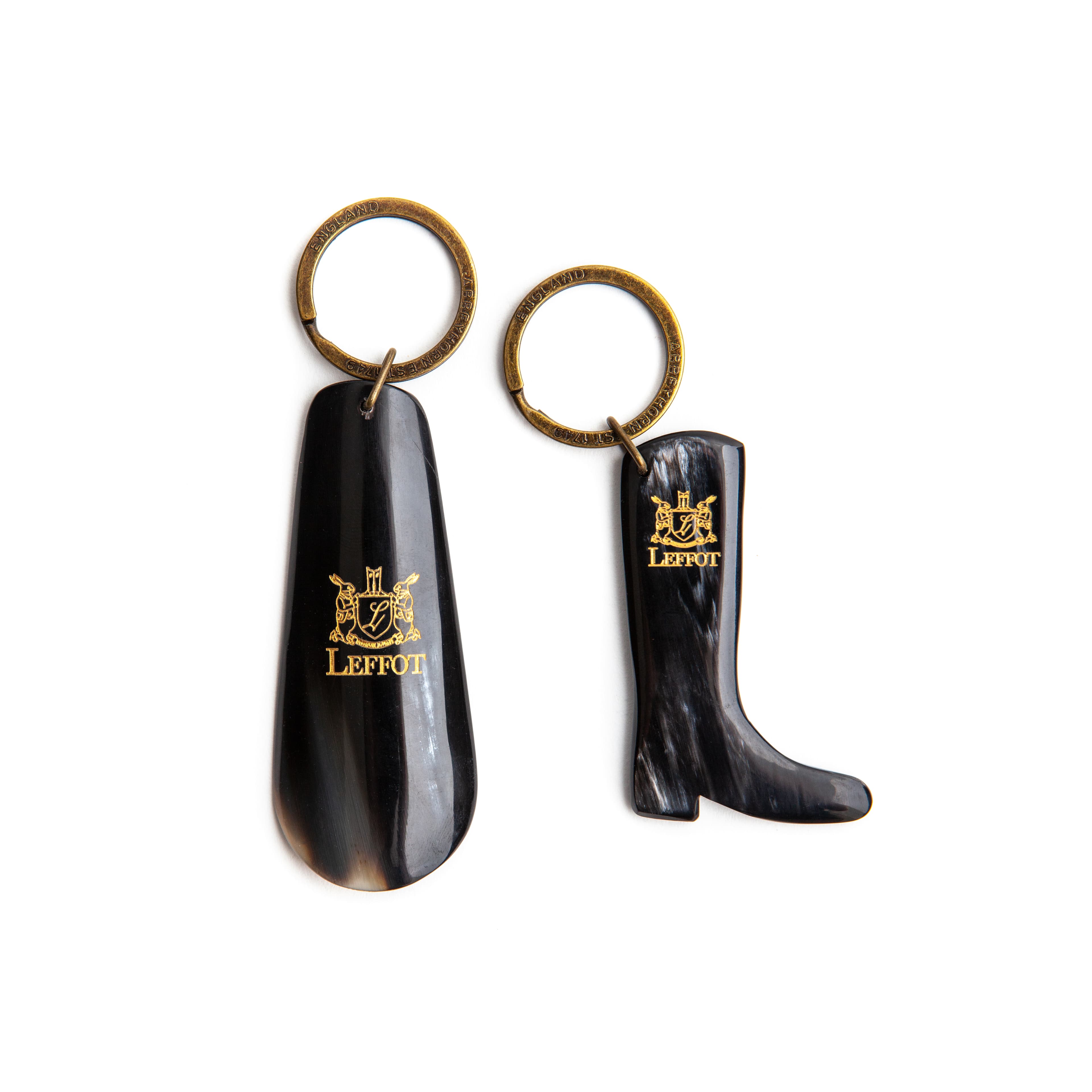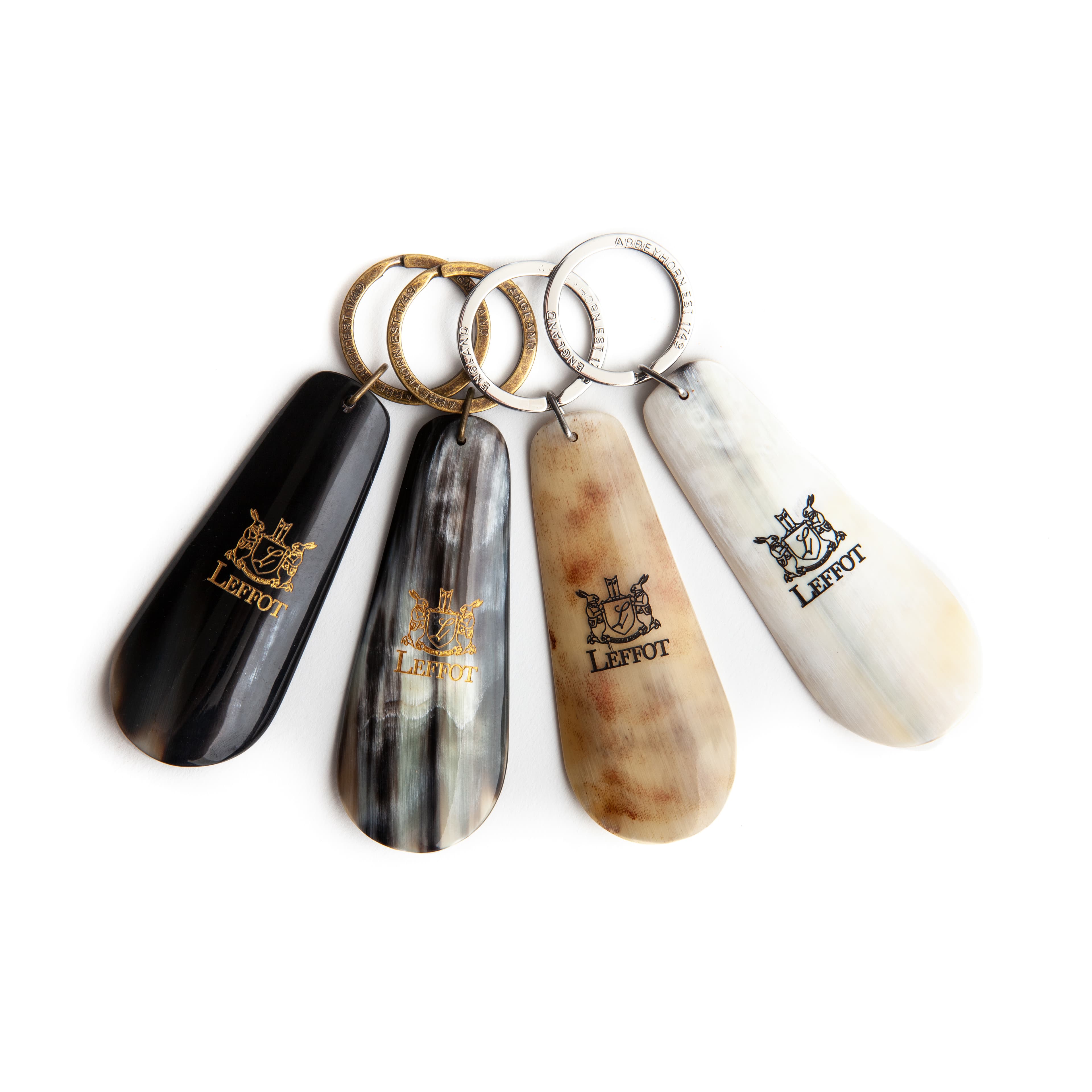 These keyrings are made from one-of-a-kind oxenhorn. Choose from two styles: a stylish boot or a small, functional shoehorn. Each is available in a dark or light shade. The color varies naturally, so each keyring is unique.