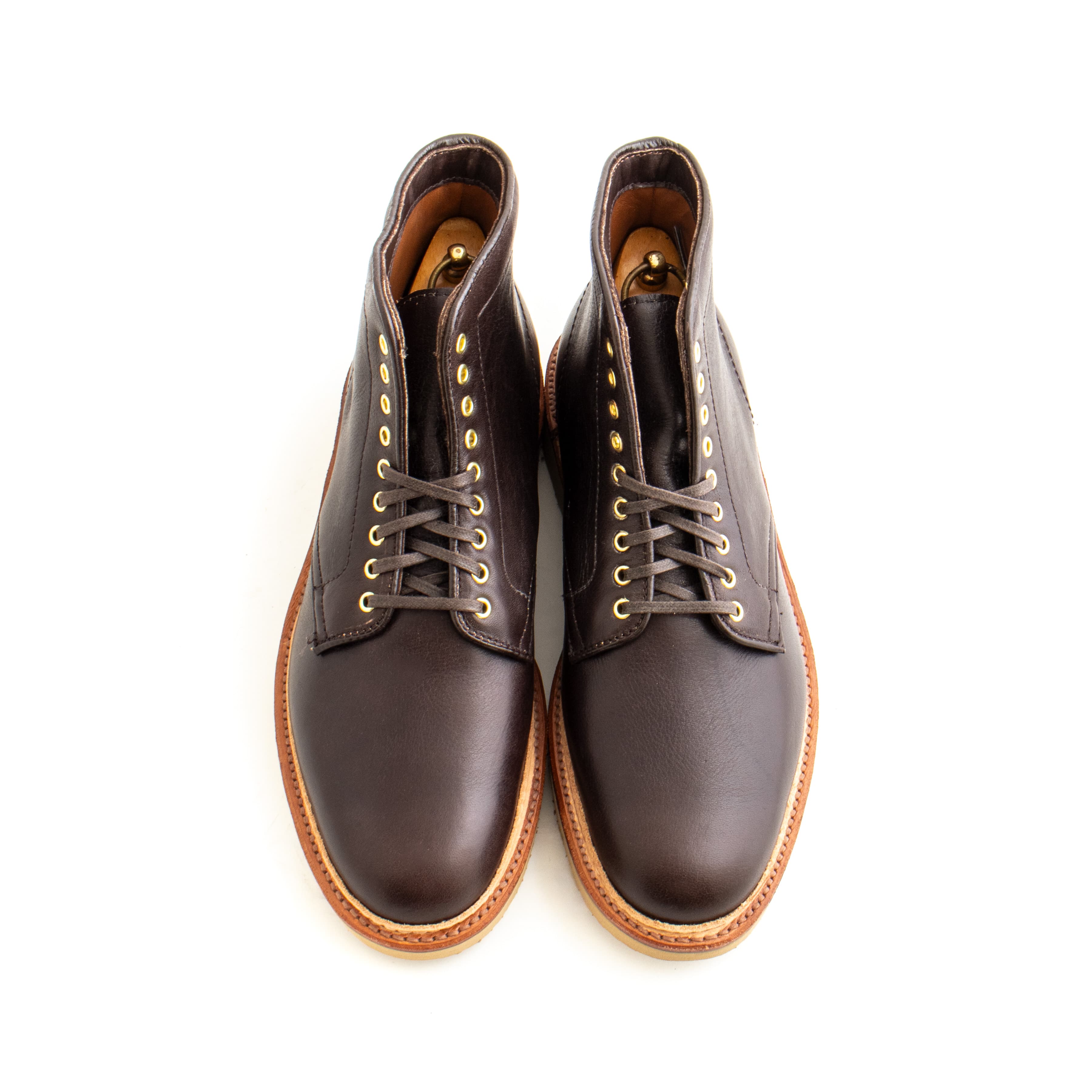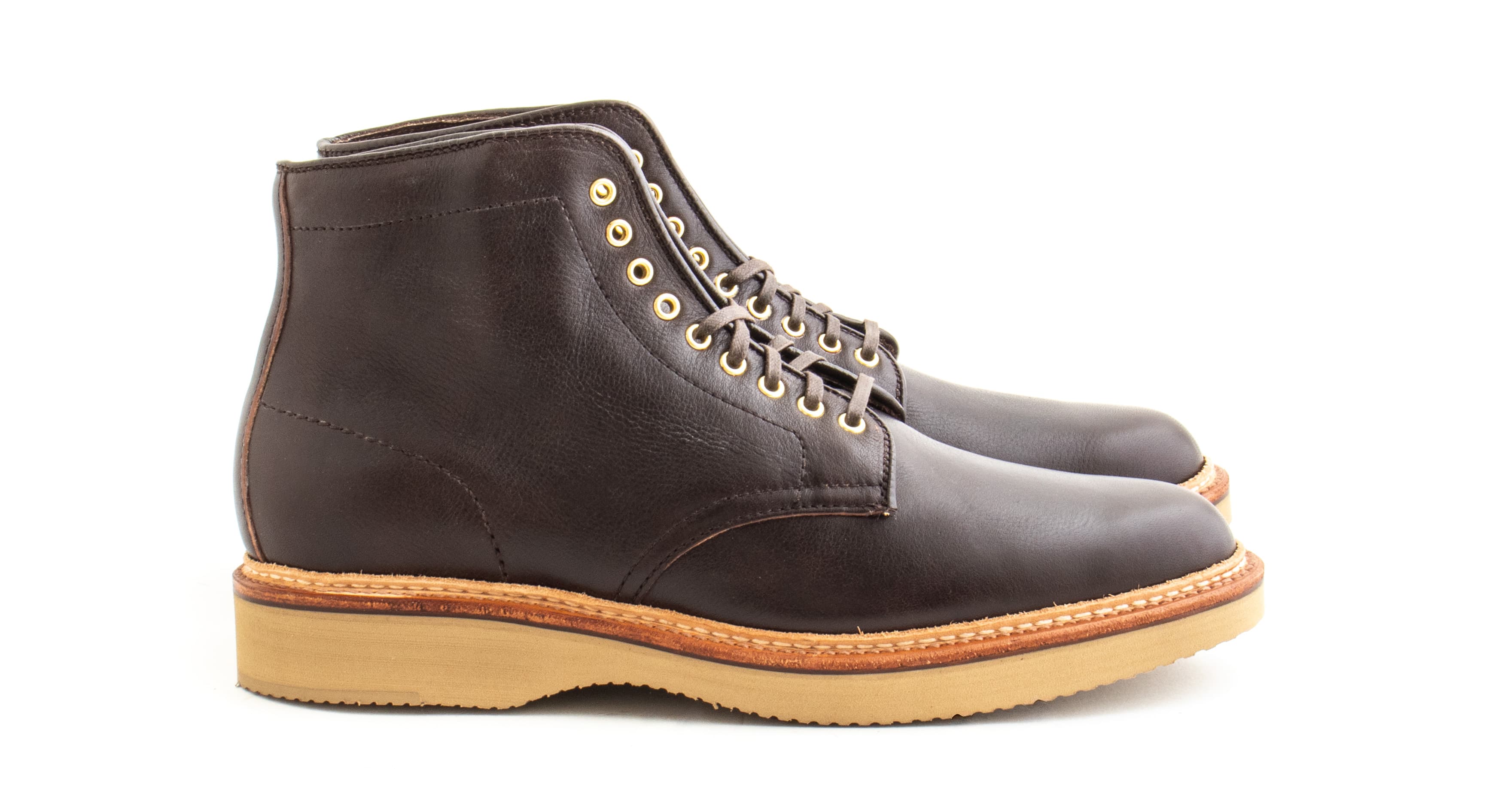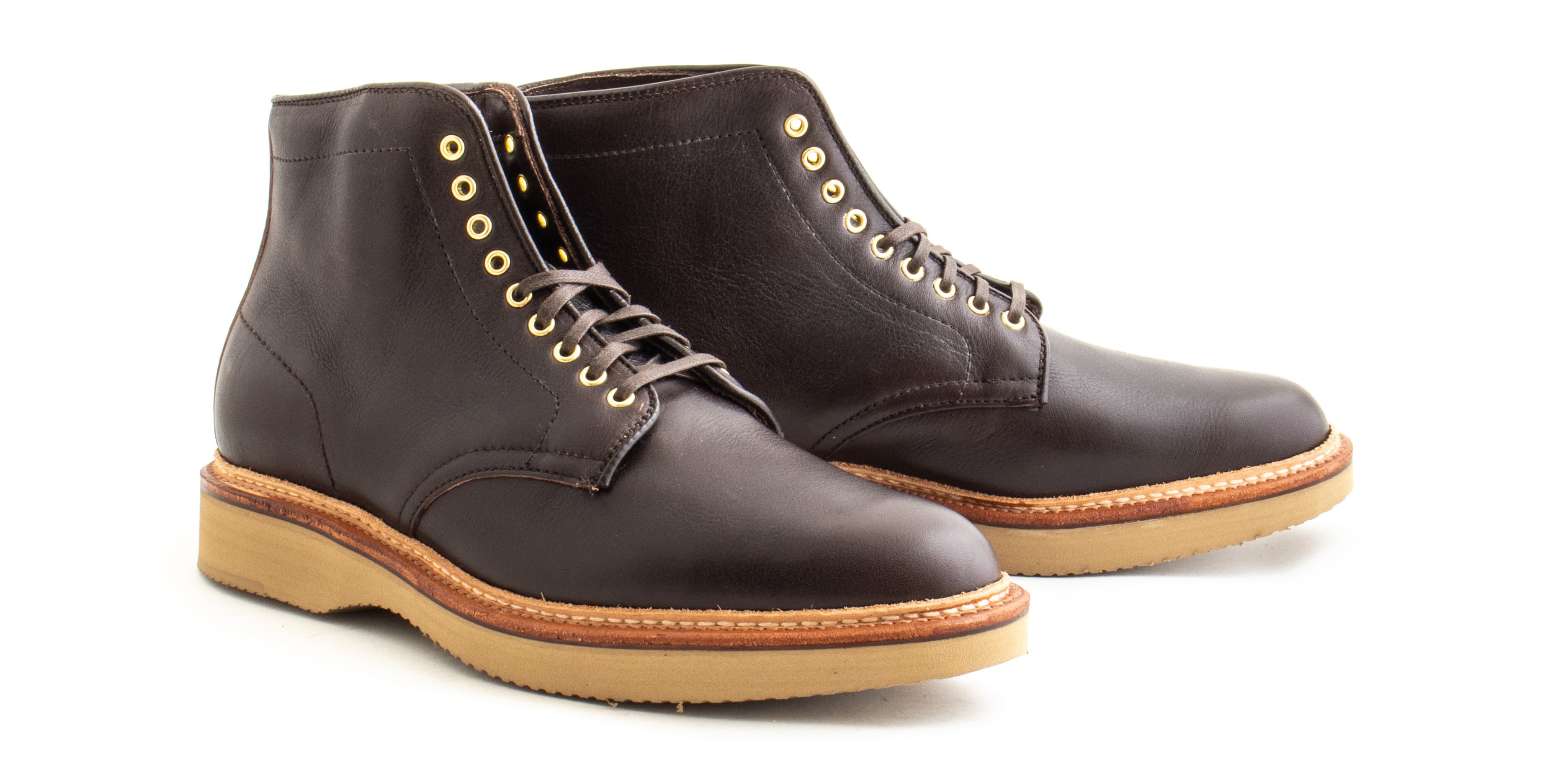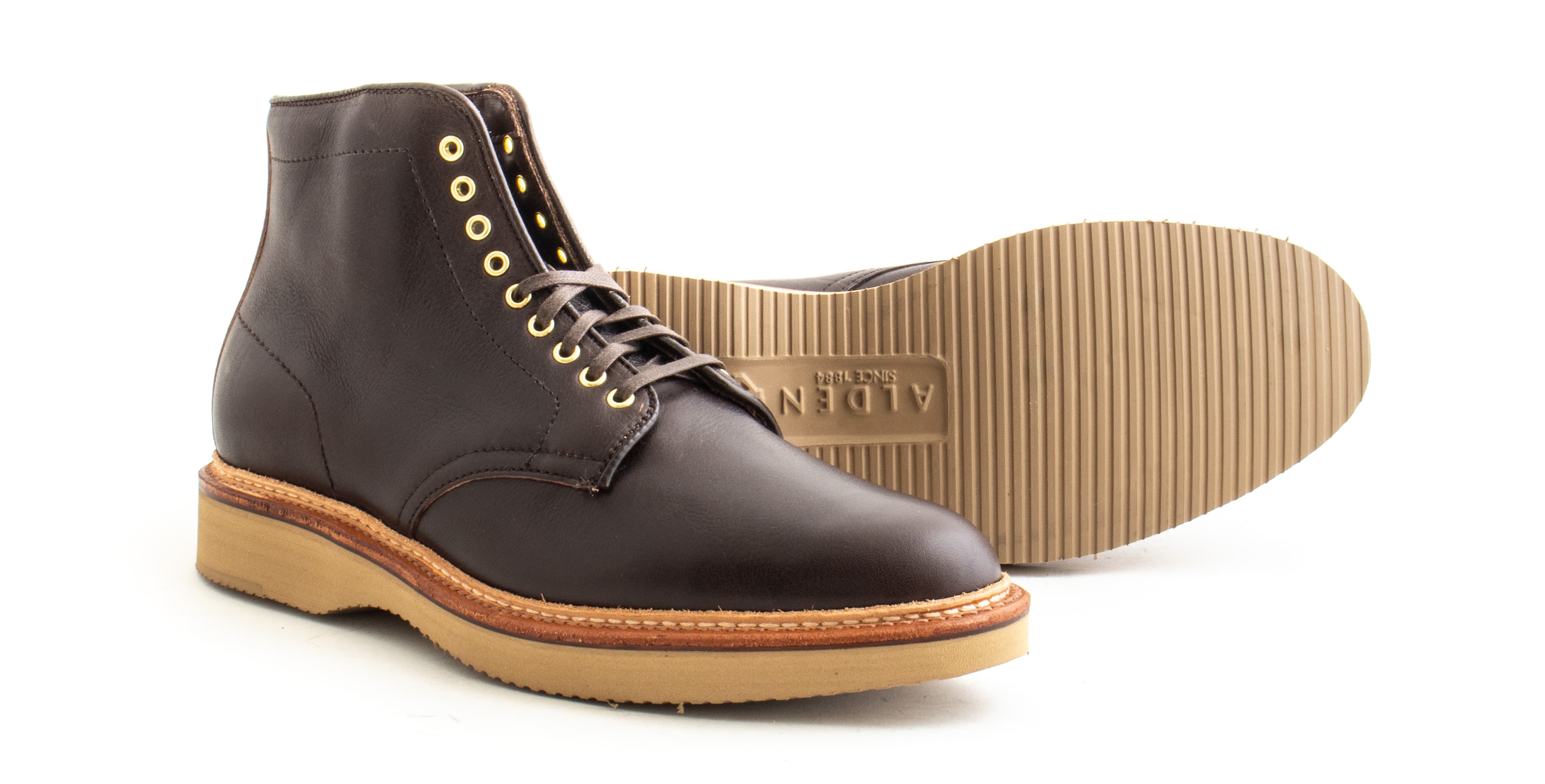 Made in Alden’s soft and supple Arabica Lux calfskin, these plain toe boots will swaddle your feet while taking on the toughest situations. Their wedge soles and brass eyelets add panache to the classic workboot style. Wear them with jeans, chinos, or cords.