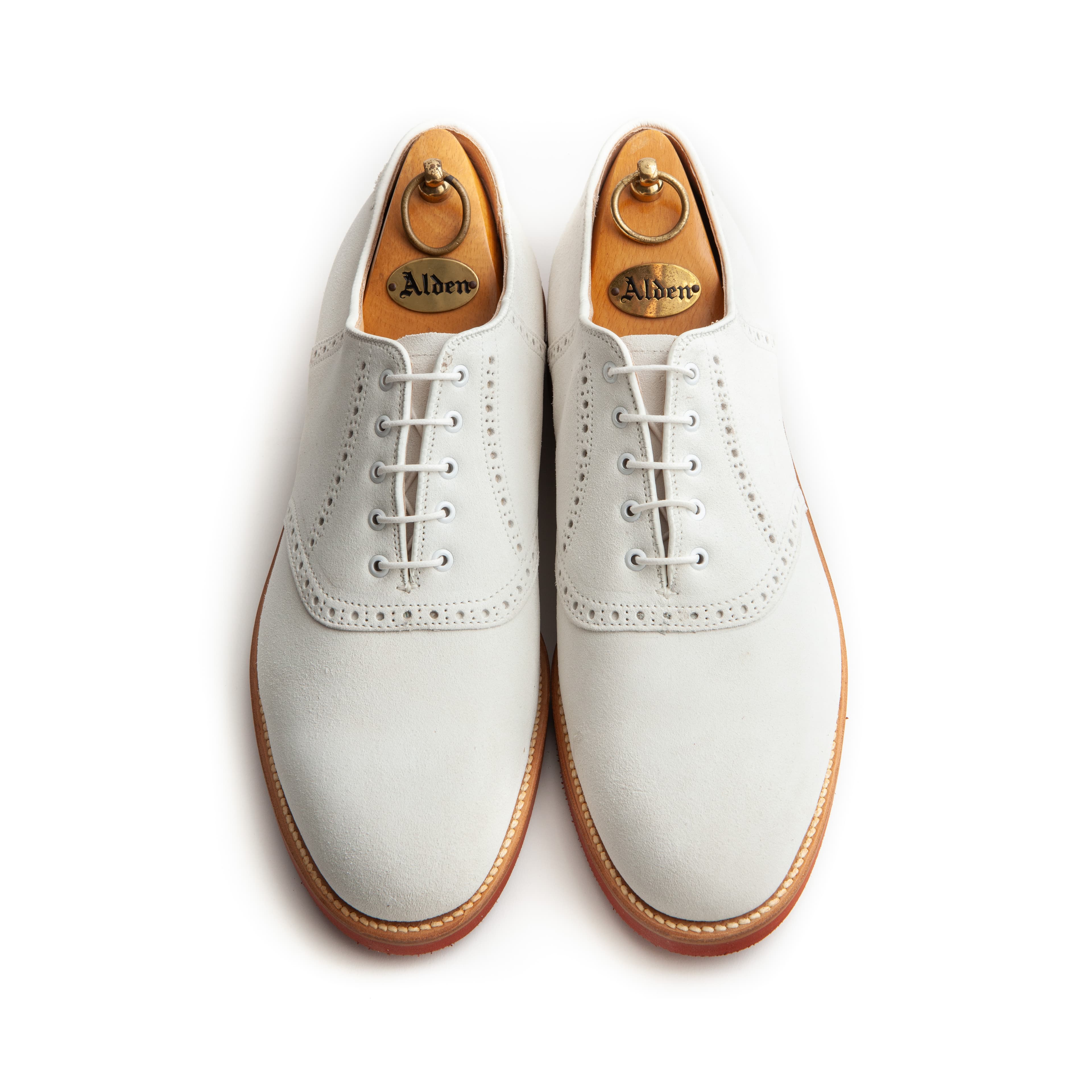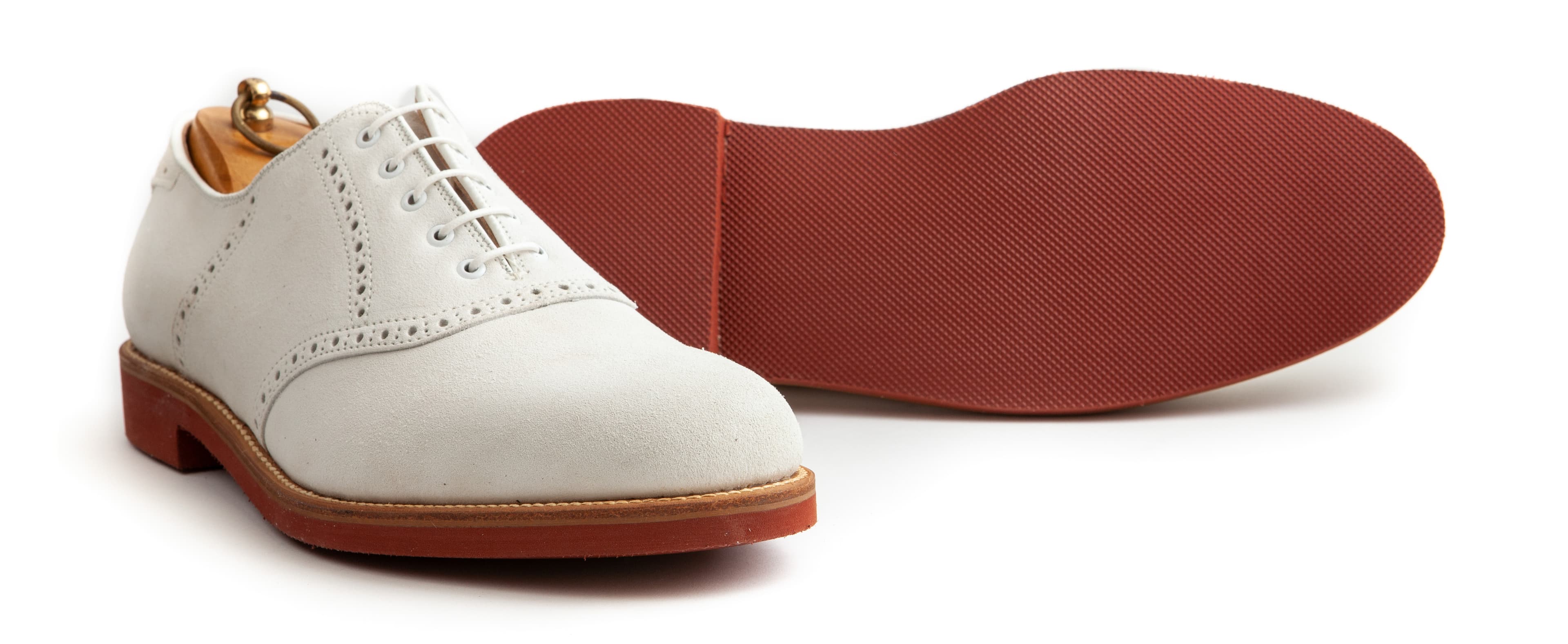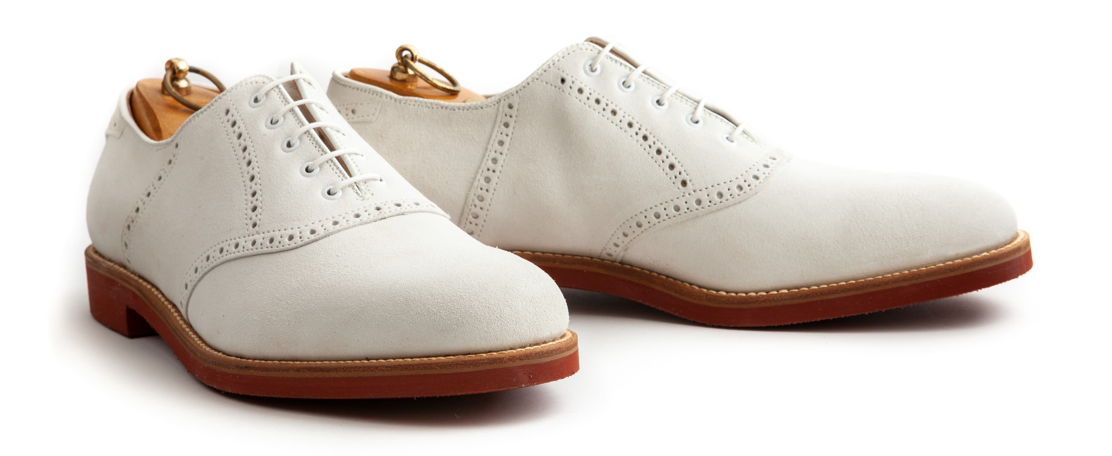 Made in white suede on red brick soles, these saddle shoes are perfect for summertime.
