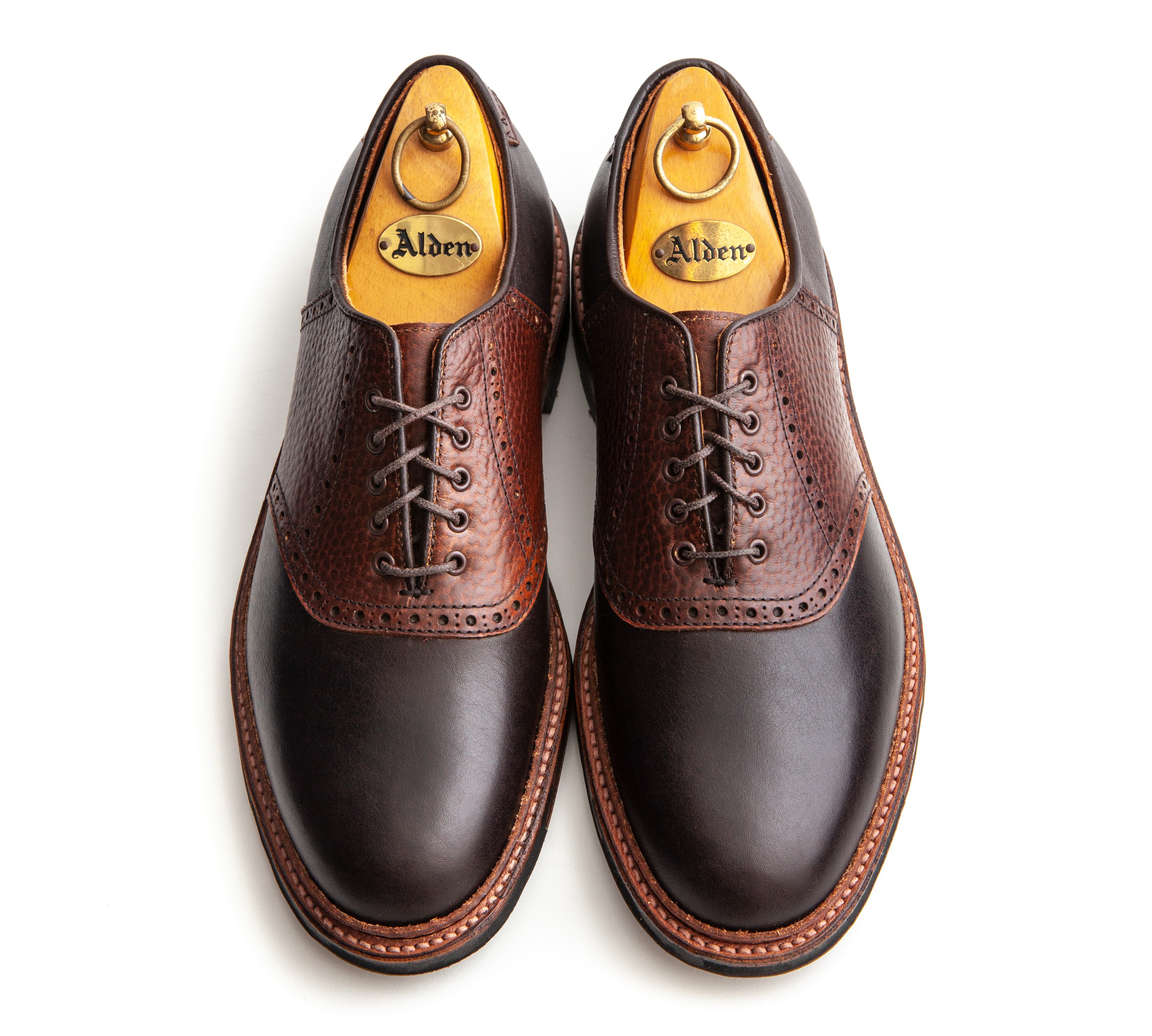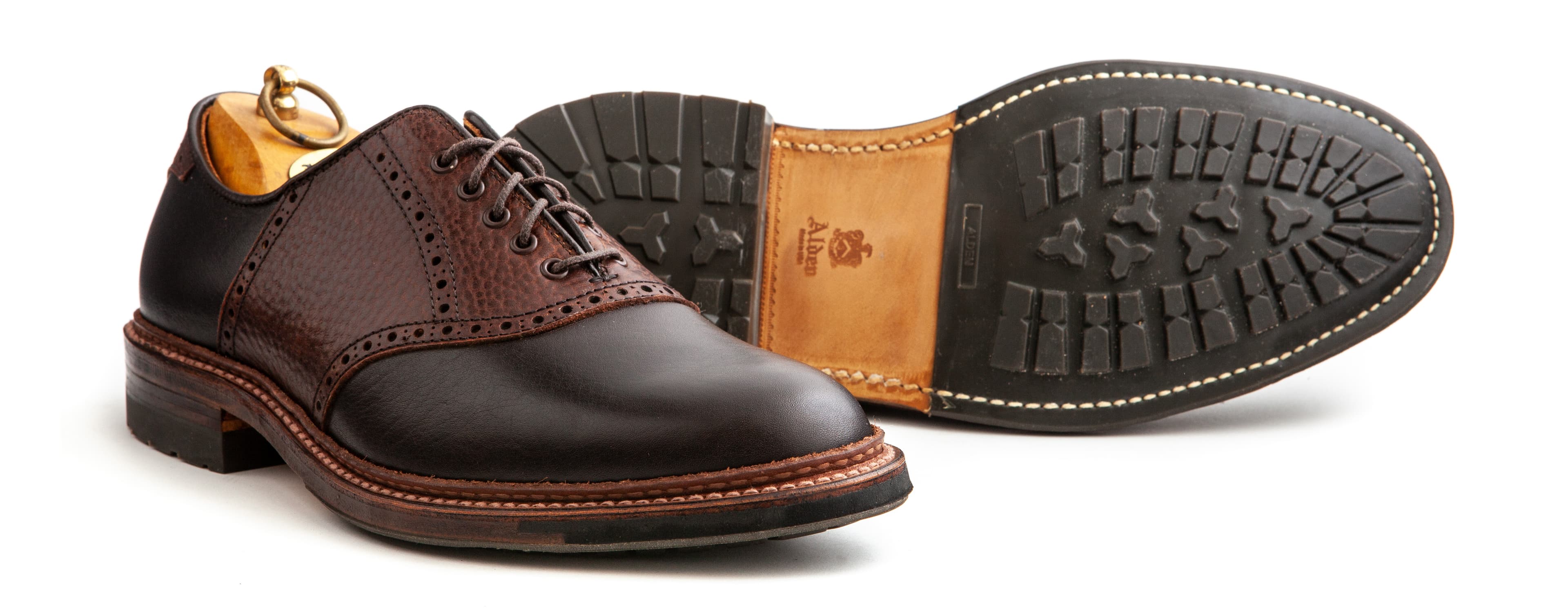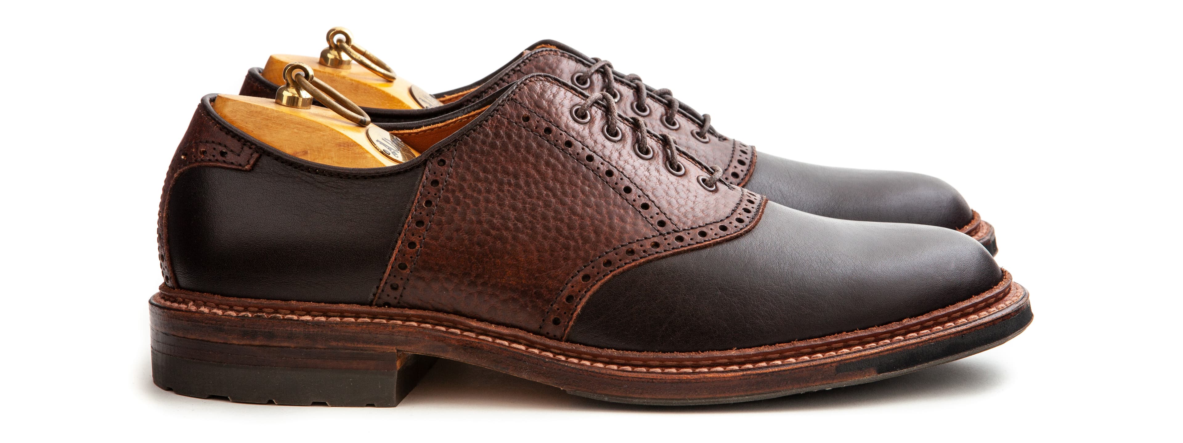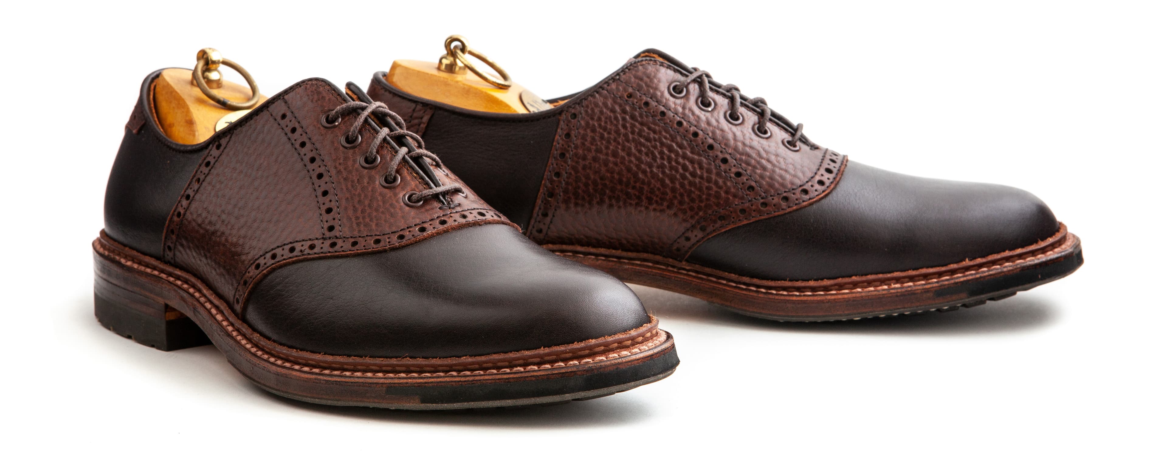 We gave these saddle shoes a rugged twist. Made on commando soles with a combination of Horween’s Arabica Lux and brown Alaska grain calfskin, they’re a preppy, casual take on the oxford.