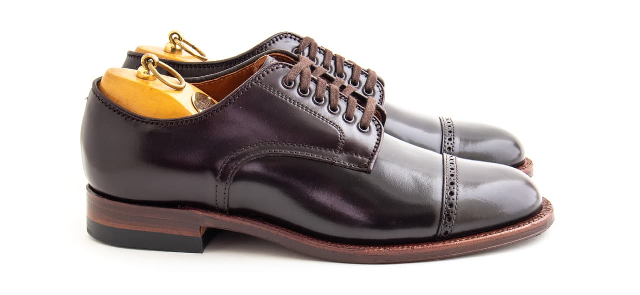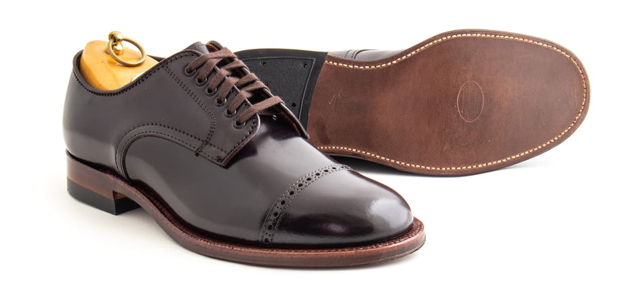 Our latest collaboration with Alden is this cap toe derby made on their 379X military last. With six metal eyelets, color 8 shell cordovan, and single leather soles, it’s an easy classic. Wear them with wide-leg chinos, denim, or vintage military trousers.