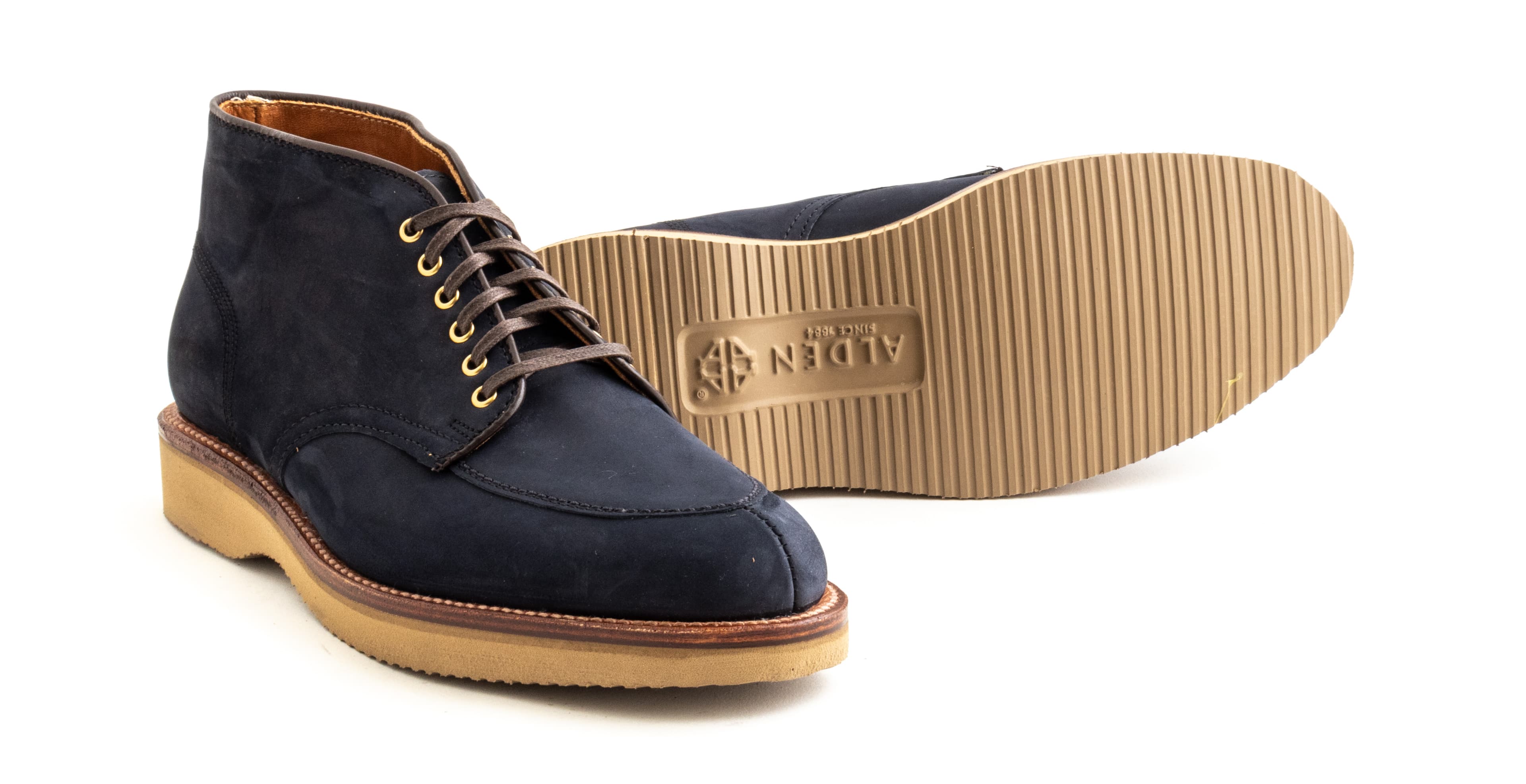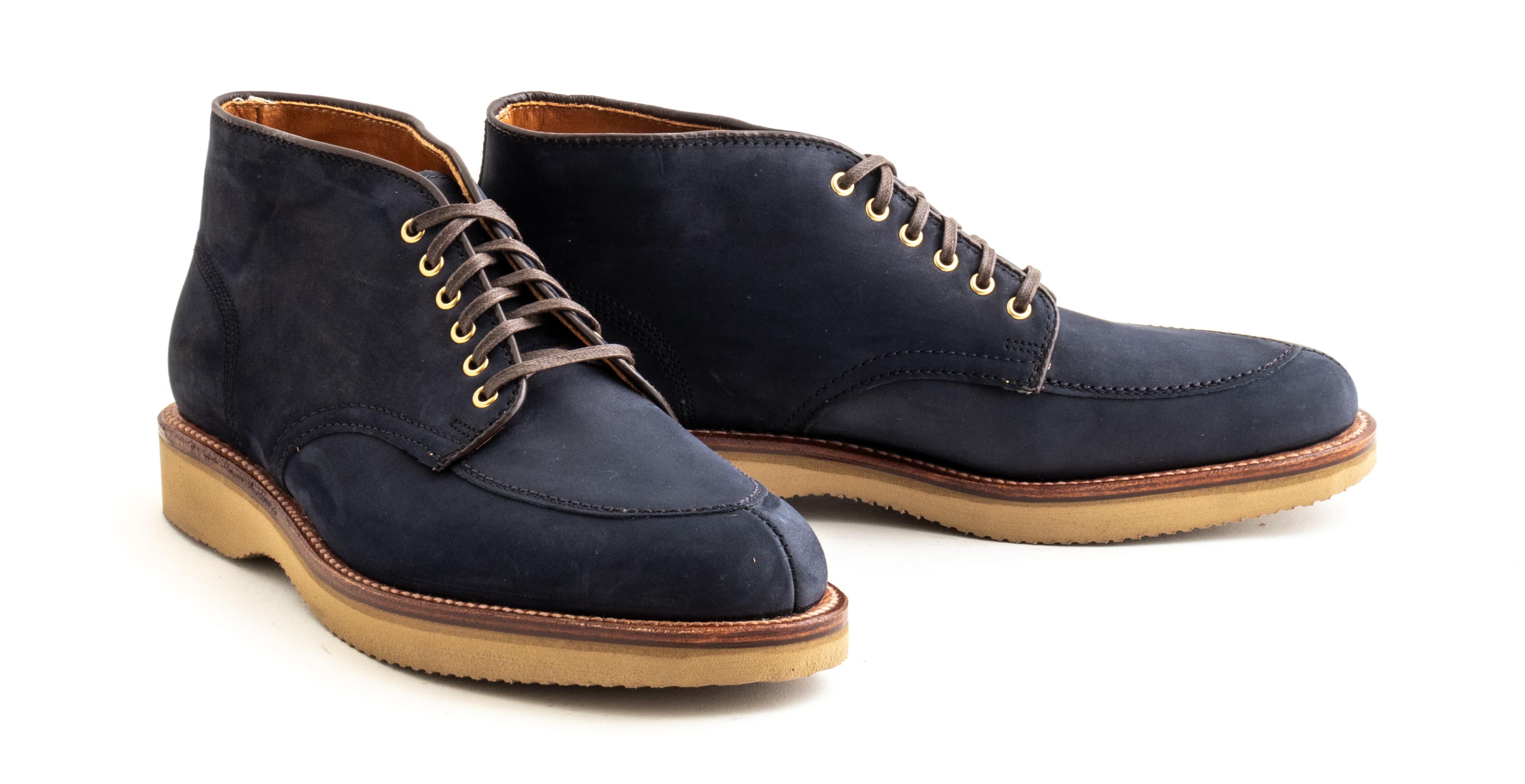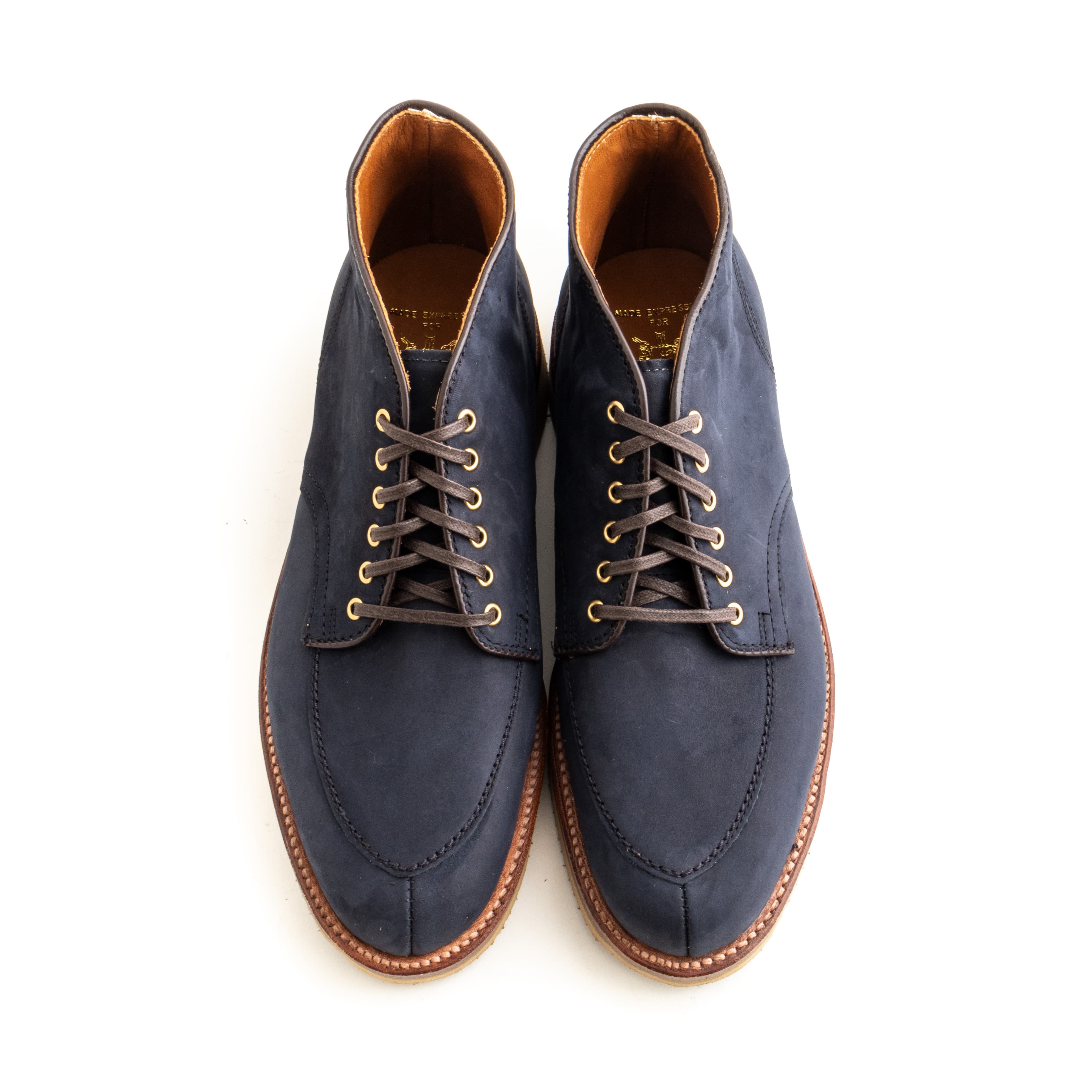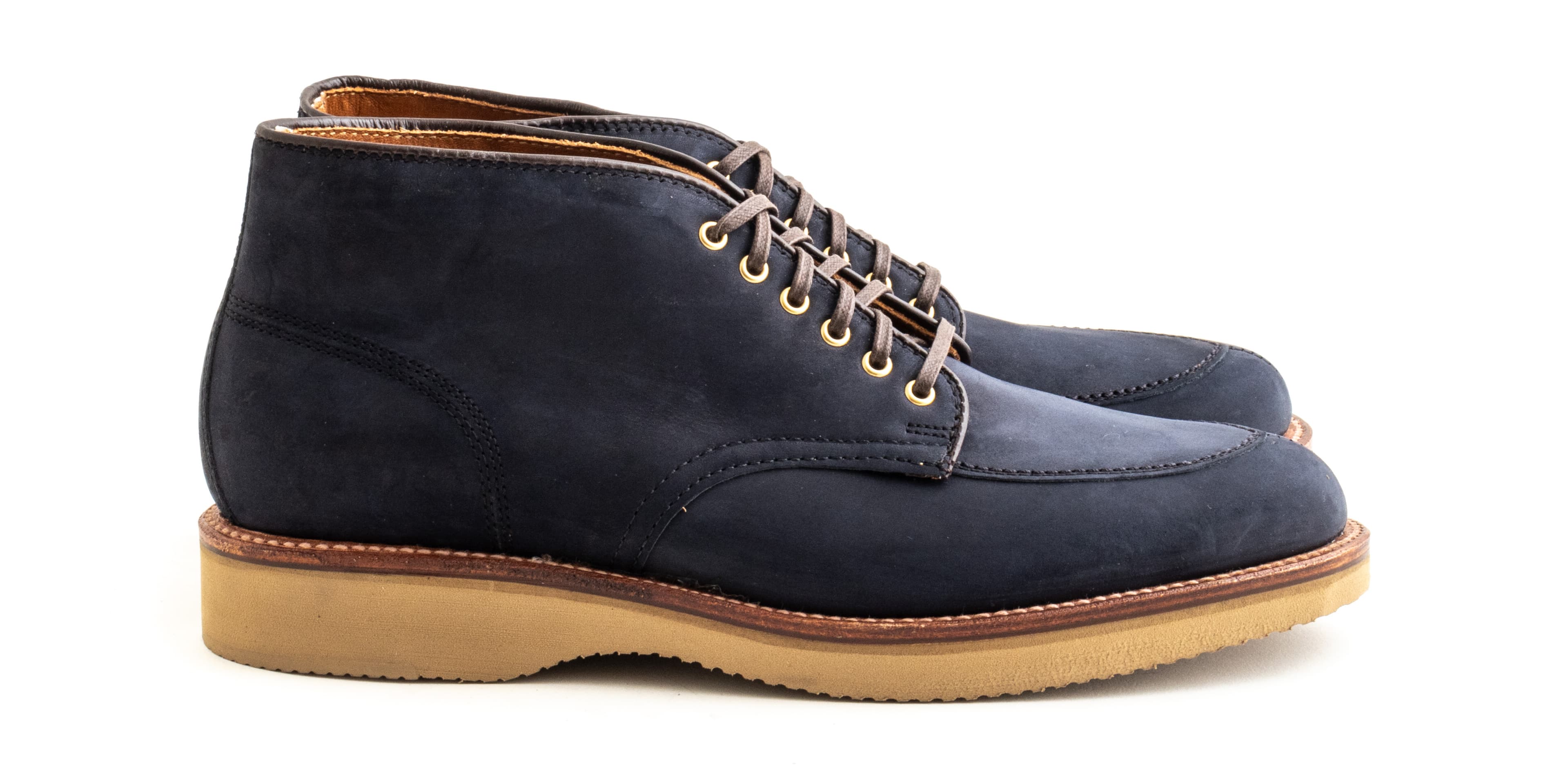 Alden’s V-Tip is a lesser-seen take on the split-toe. Made with machine stitching along the vamp and toe, it has a sleeker look than Alden’s handsewn NST. We’ve made this pair in navy nubuck with wedge soles and brass eyelets.