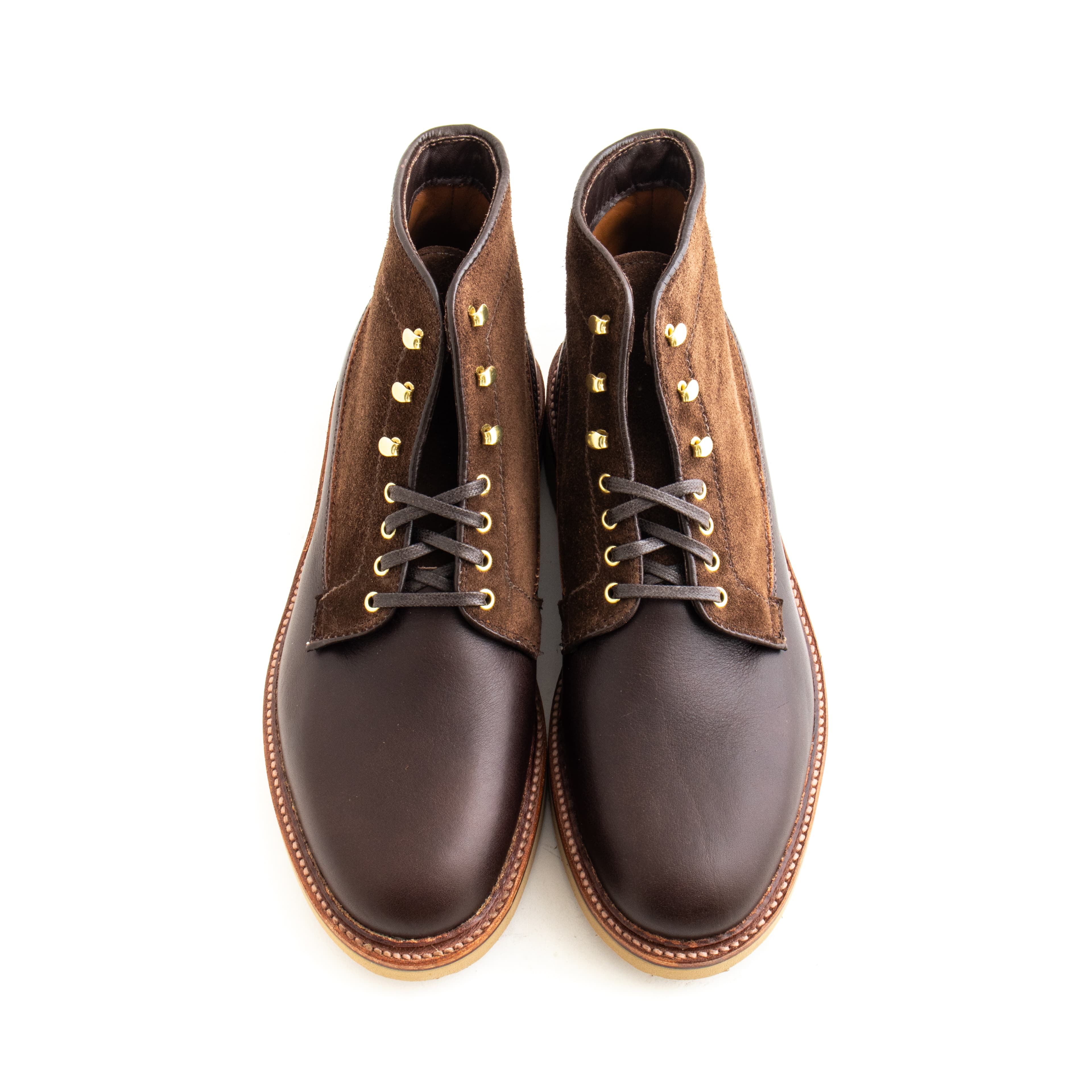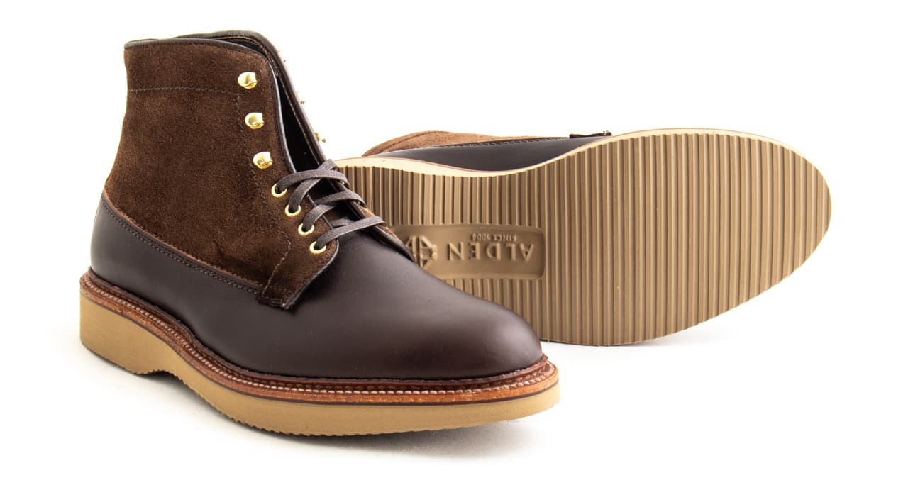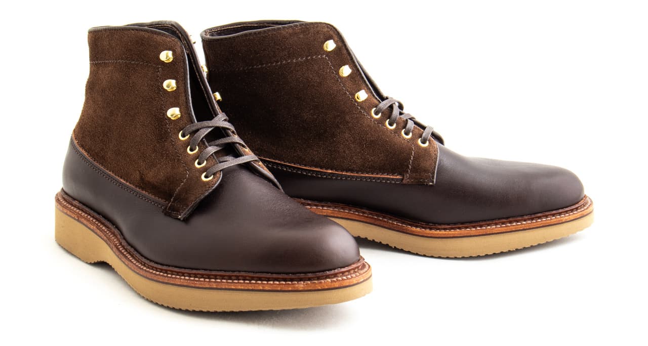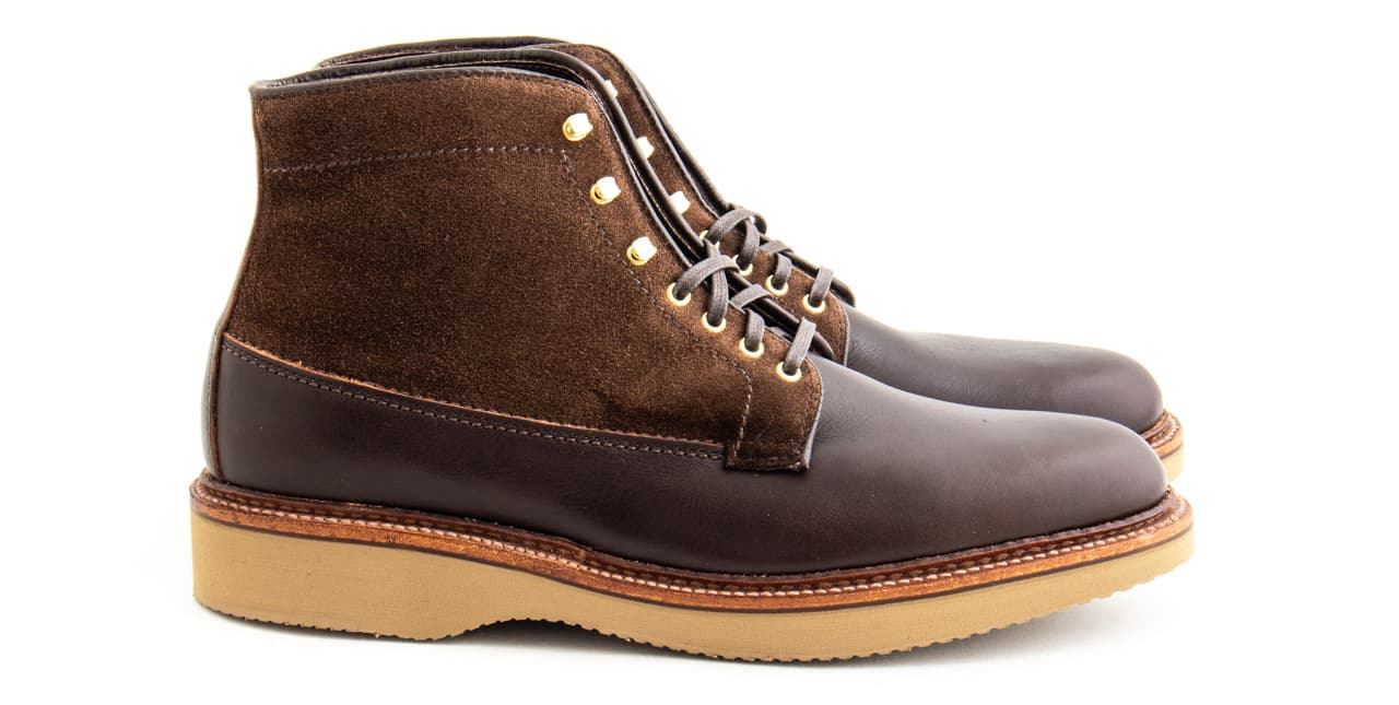 The Williamsburg boot is an Alden x Leffot exclusive, made in Arabica Lux and Humus suede. The generous Barrie last combined with wedge soles make for a comfortable, casual boot that pairs well with military chinos or denim. The brass eyelets and tan outsoles add a touch of contrast and plenty of character.