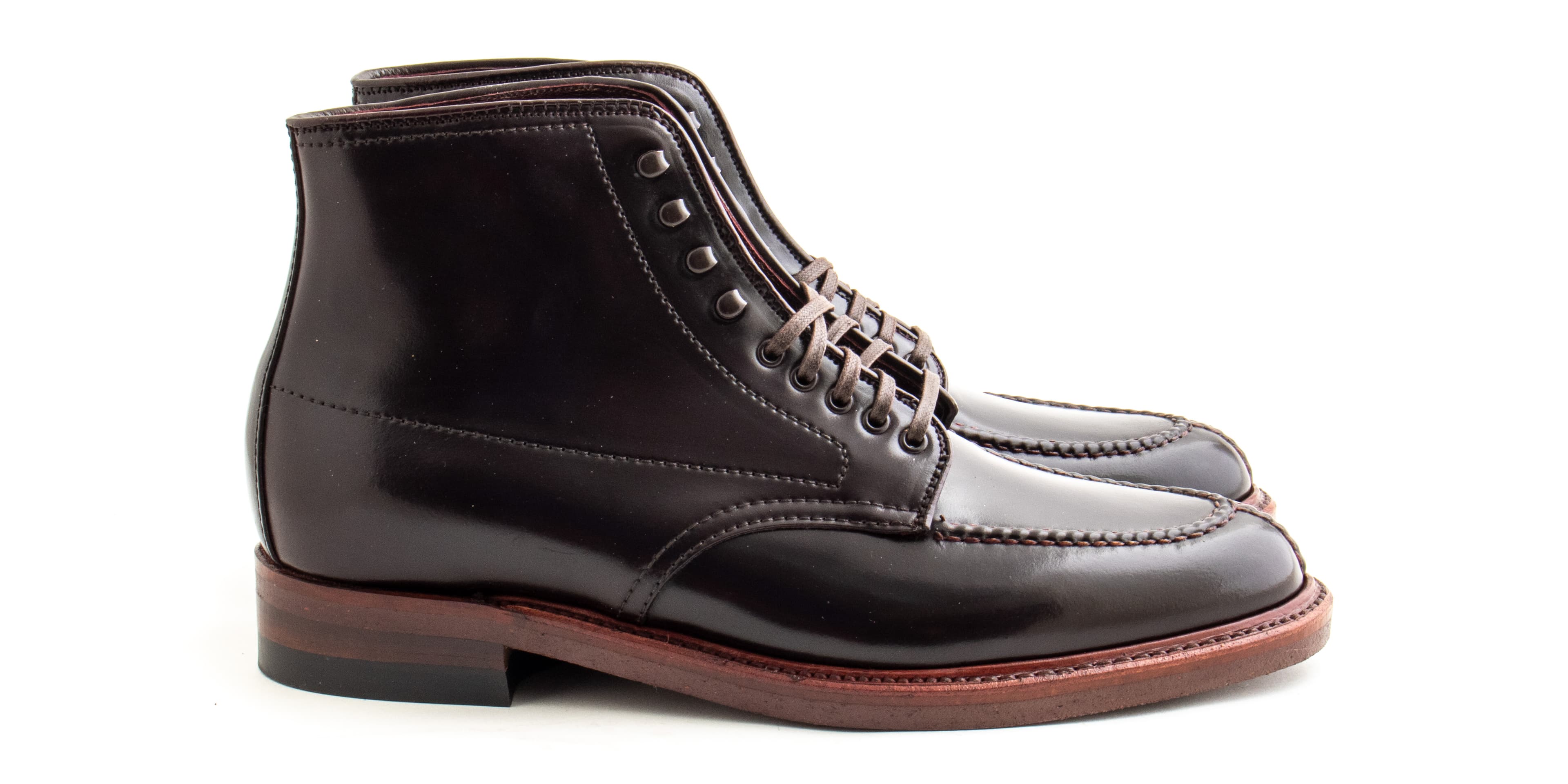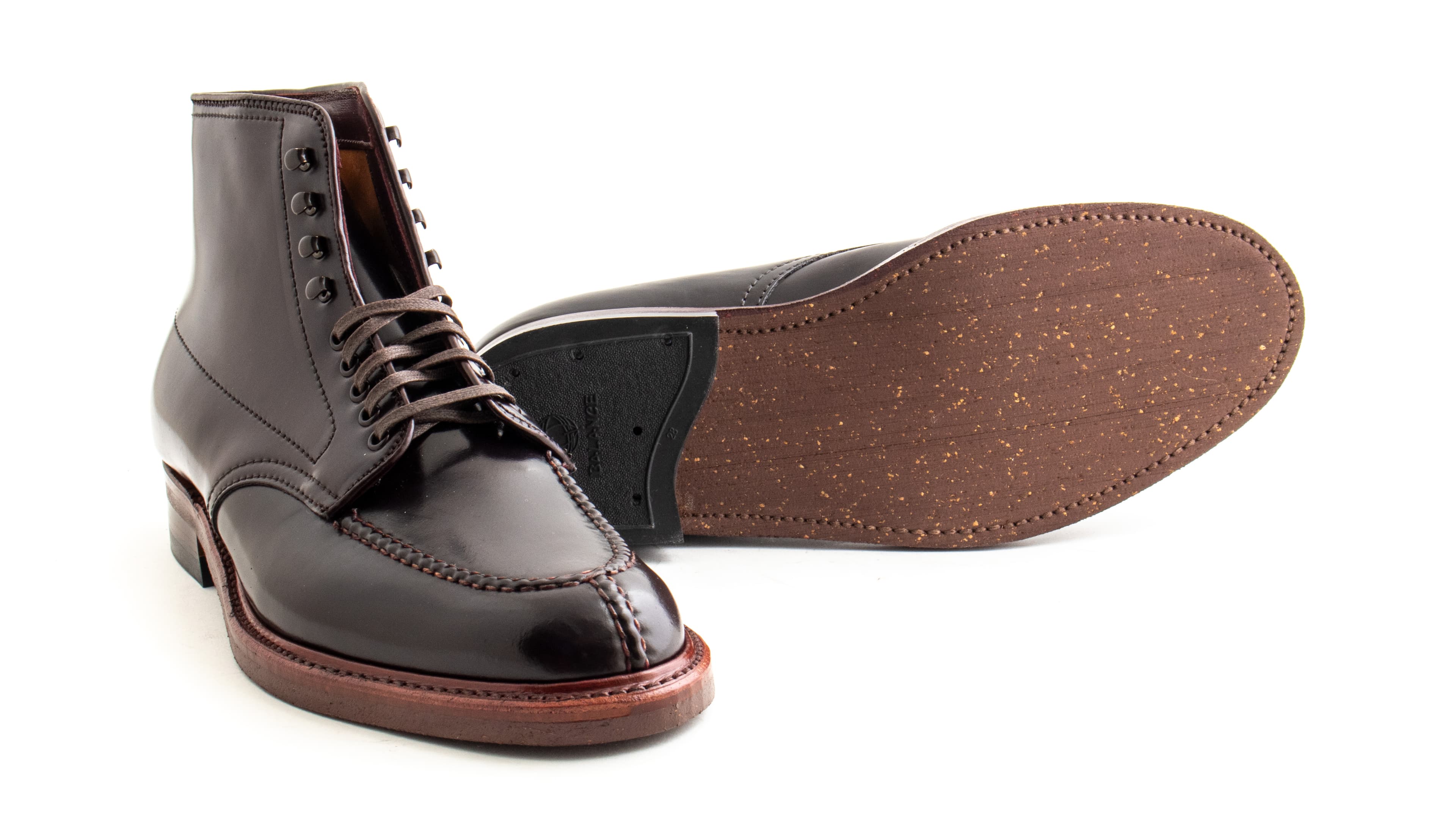 The Tanker Boot is a take on our of our favorite styles, the NST or Norwegian Split-Toe. We’ve made this pair in color 8 shell cordovan on cork neoprene soles. The Barrie last gives them a classic round shape.