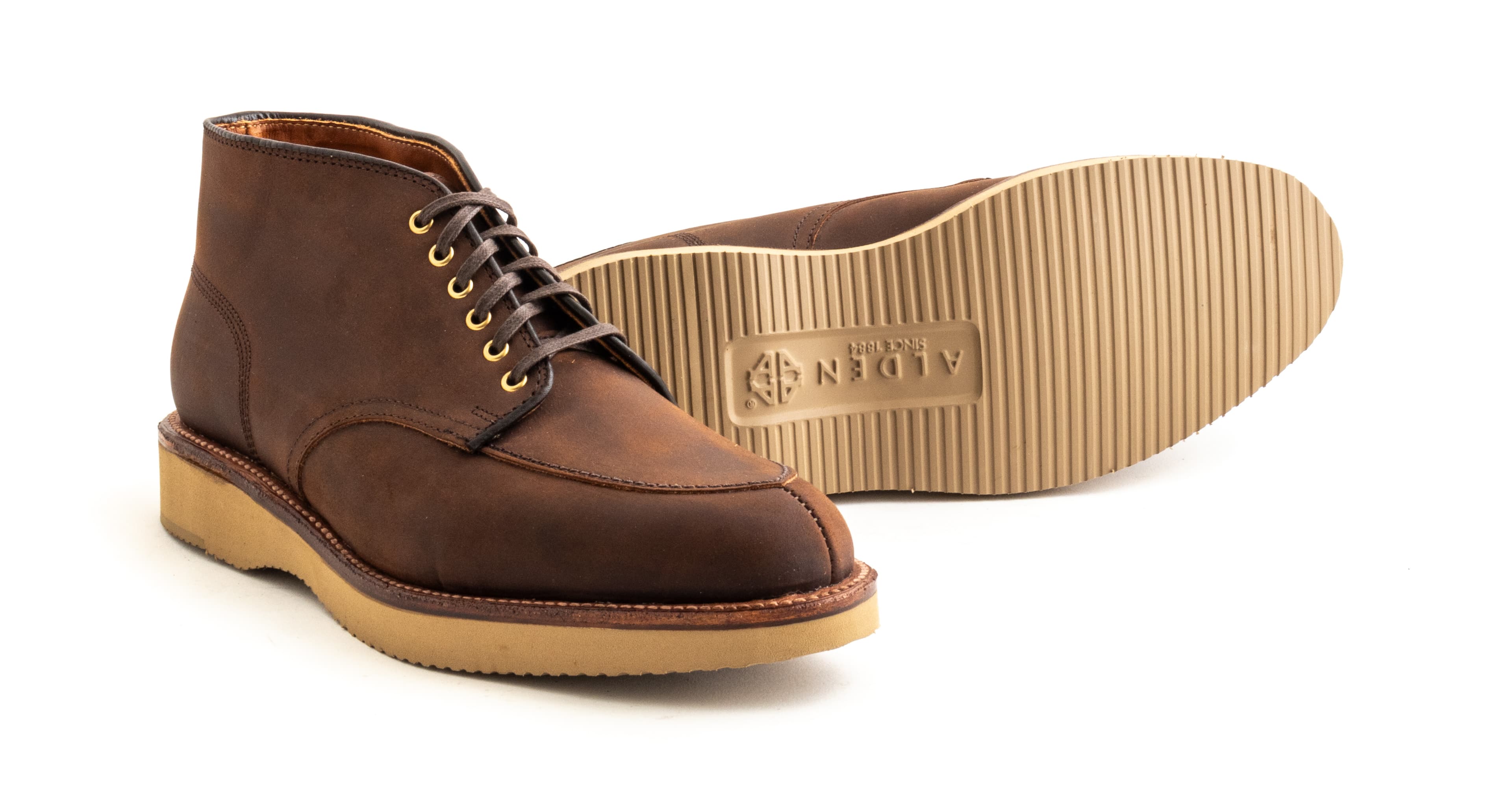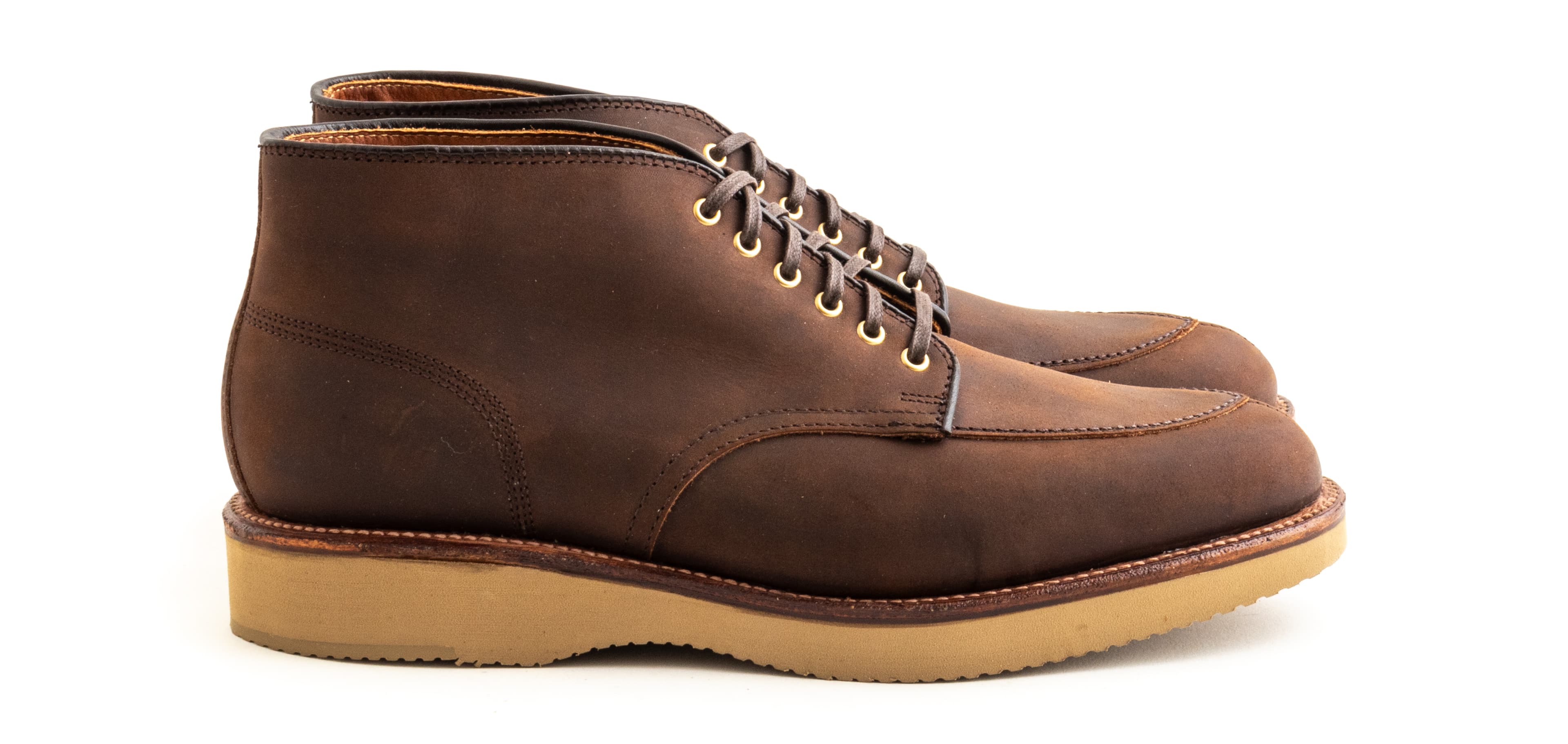 Alden’s V-Tip is a lesser-seen take on the split-toe. Made with machine stitching along the vamp and toe, it has a sleeker look than Alden’s handsewn NST. We’ve made this pair in tobacco chamois with wedge soles and brass eyelets.