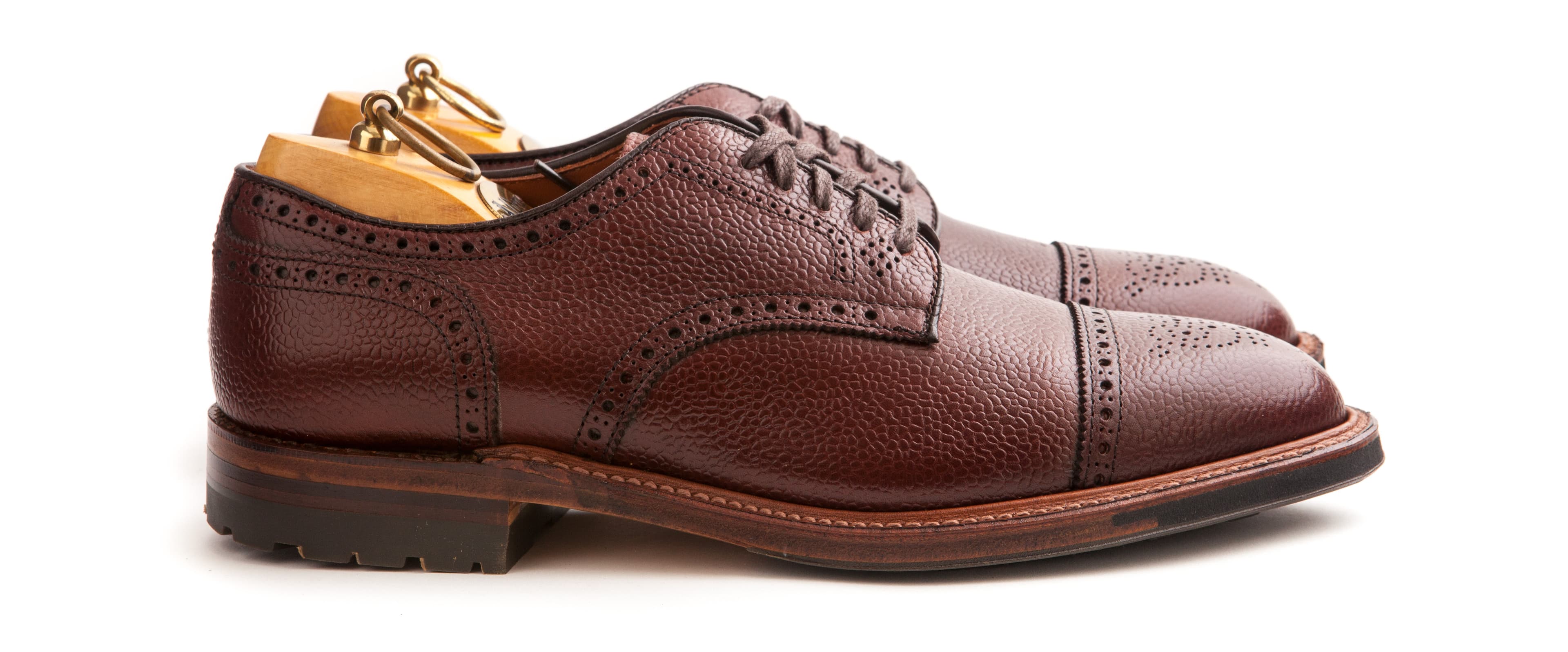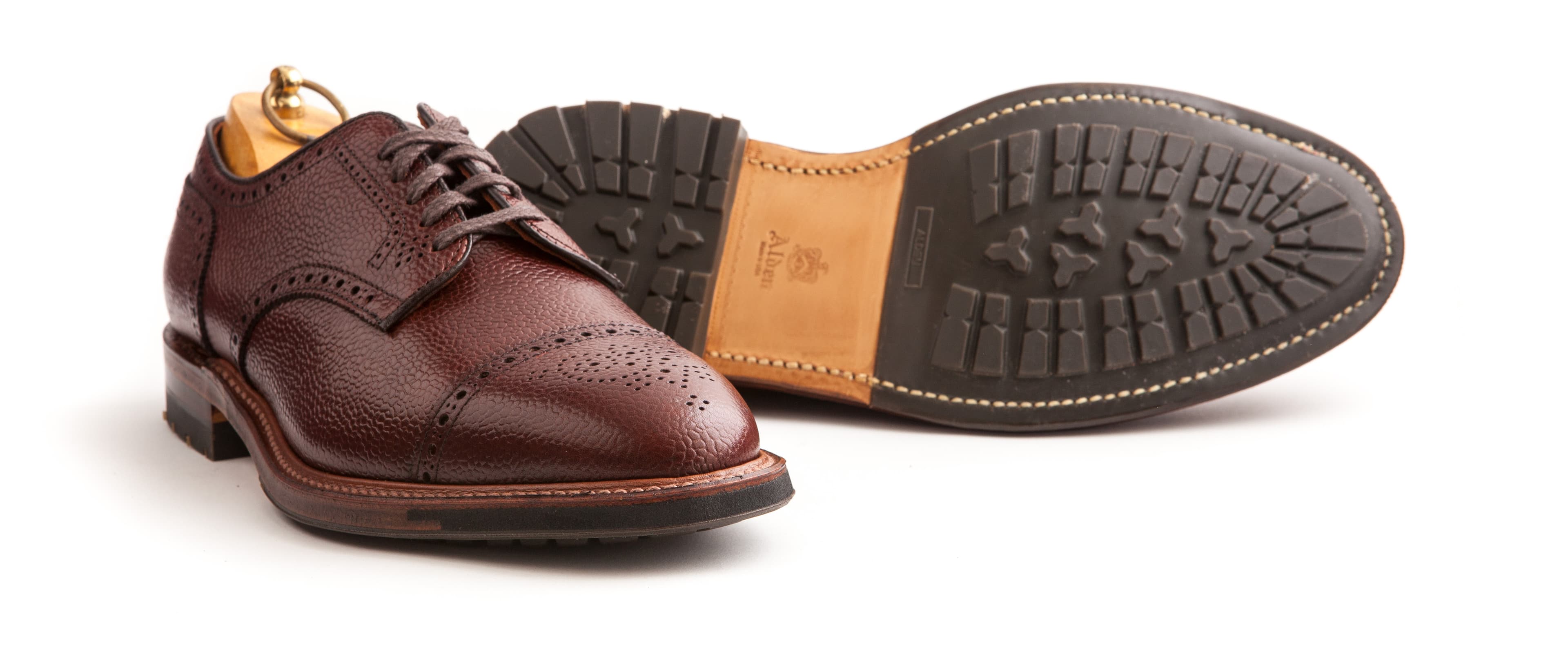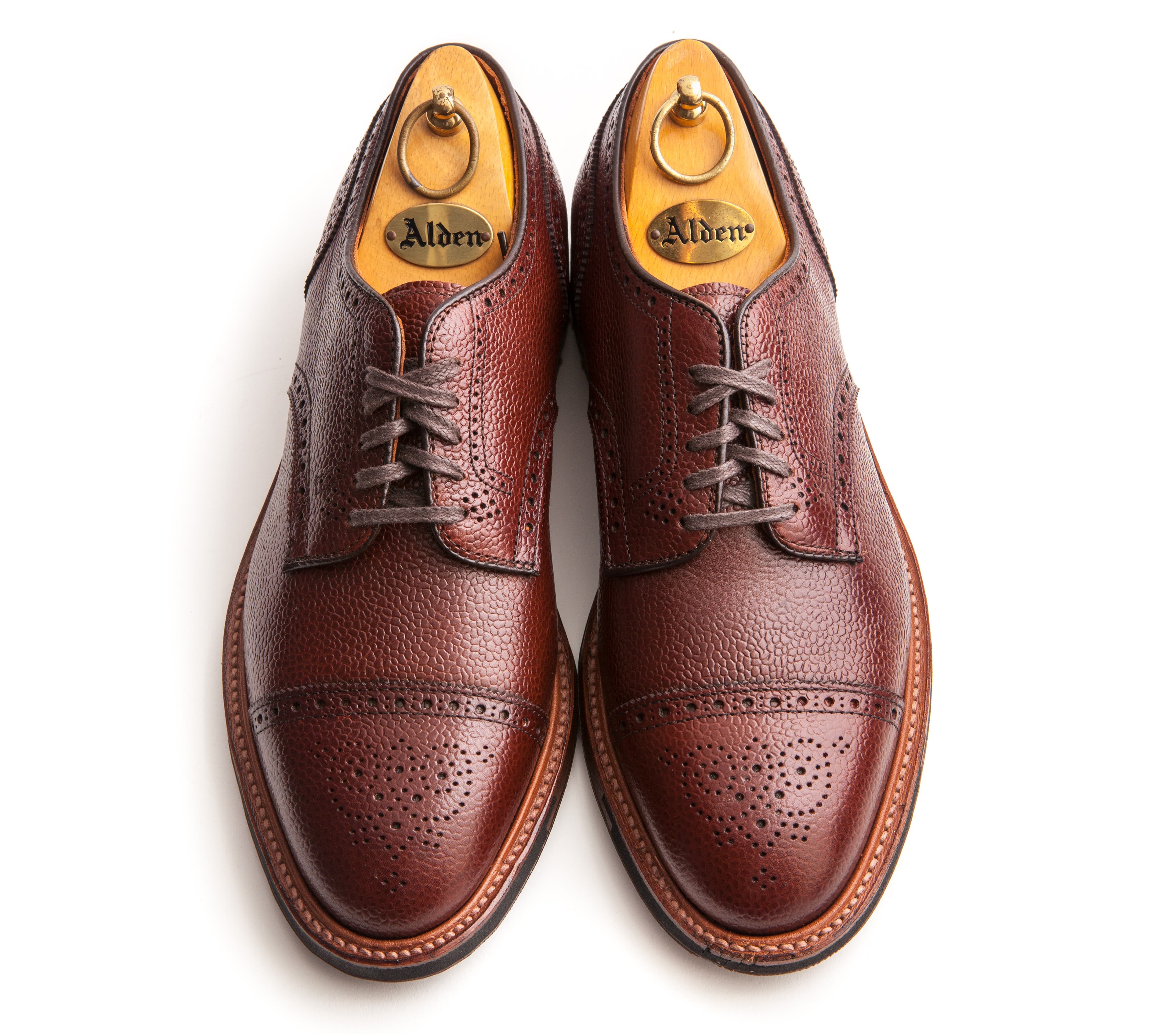 Made in brown scotch grain calfskin on commando soles, this pair of Alden derbys is a rugged take on the classic five-eyelet captoe.