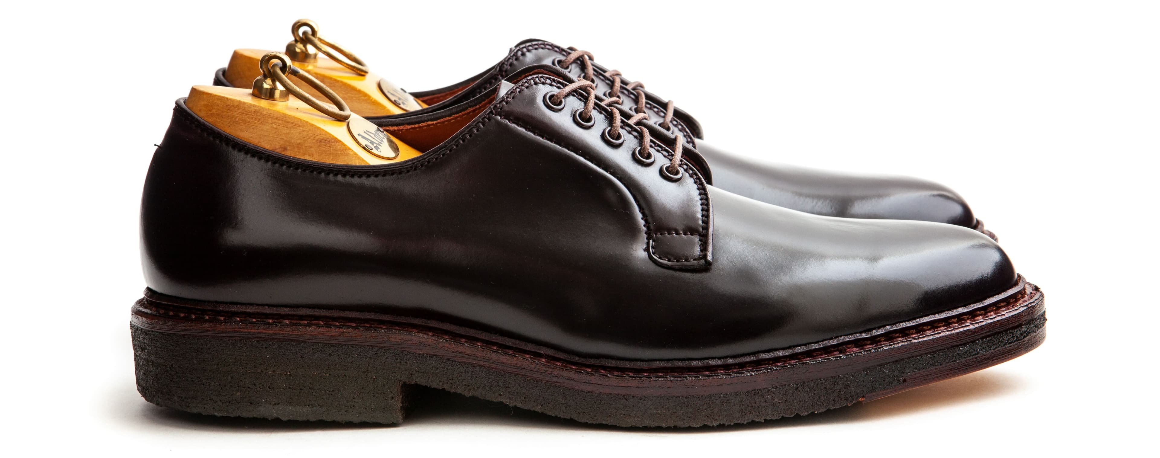Alden’s color 8 shell cordovan plain toe blucher is the ultimate staple shoe. It’s both simple and elegant, casual and austere, rugged and refined. This pair is made on comfortable crepe soles that make nearly anything you walk on feel like carpet.