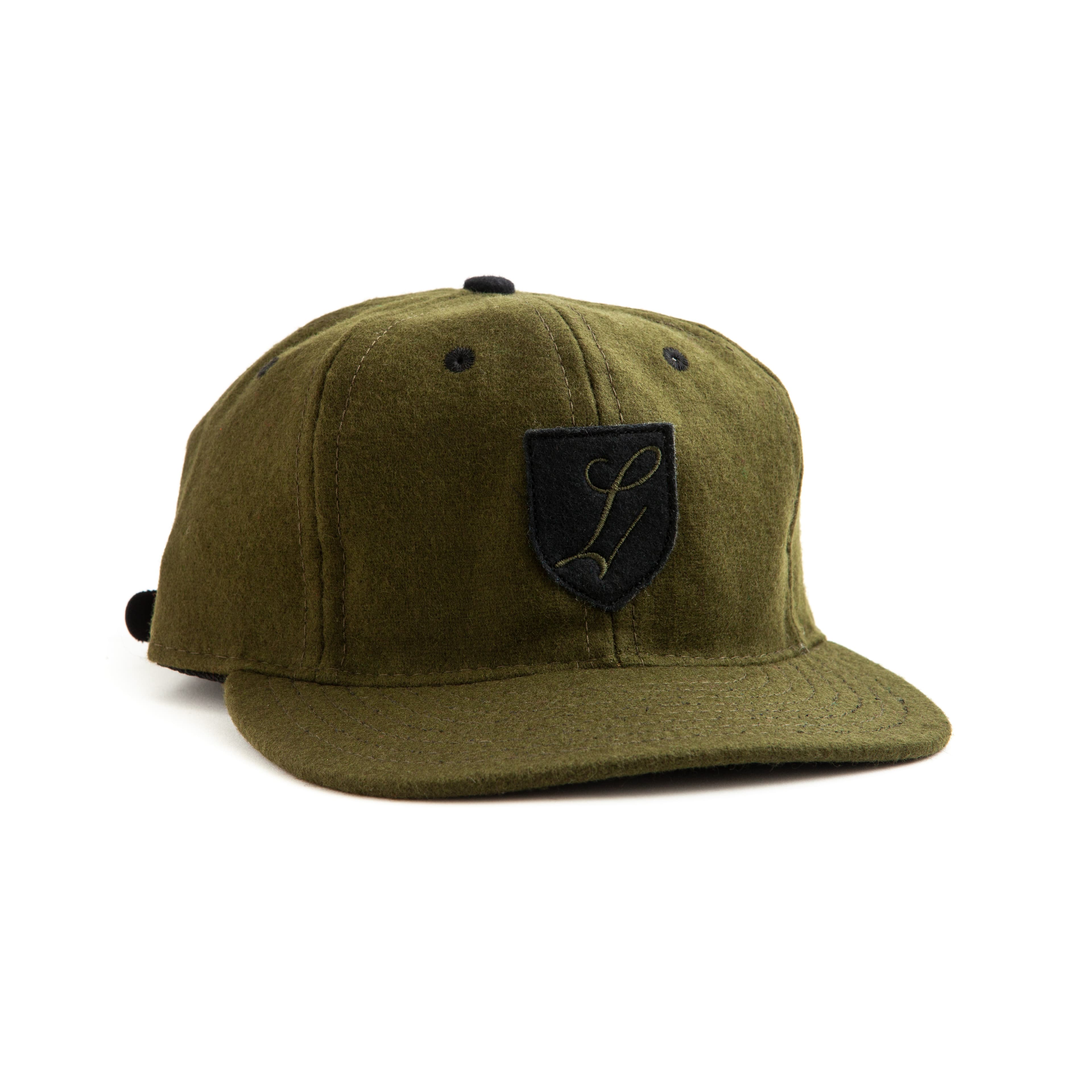 Our cap is made in olive wool with an L embroidered on its black crest. We’ve added black satin beneath the visor, as well as a black leather strap. Sizing is adjustable.