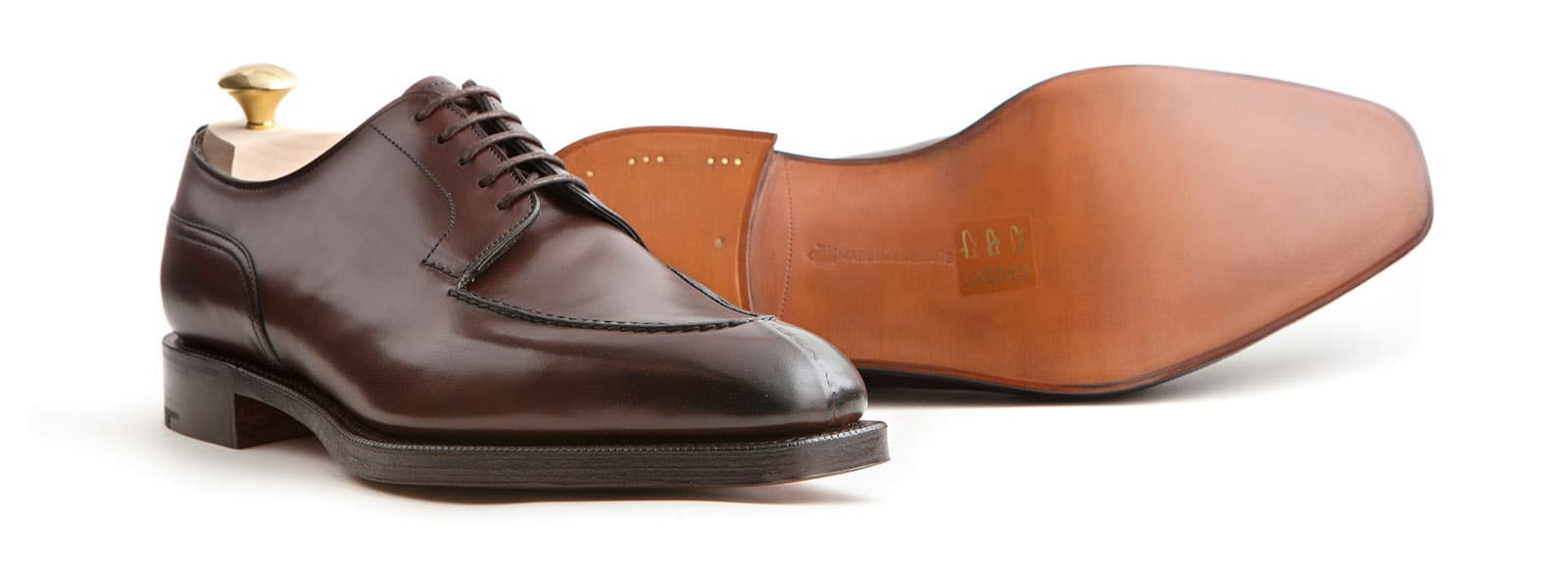 The Dover is Edward Green’s signature shoe — a blucher with a hand-sewn vamp. The hand-sewing process is so delicate that a pig’s bristle must be used to sew rather than a needle. We’ve made these Dovers in Edward Green’s Dark Brown Calfskin with HAF shoes. This shoe is one for the ages: comfortable, useful, and very unique.