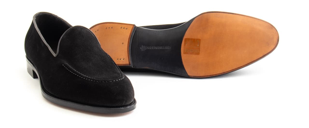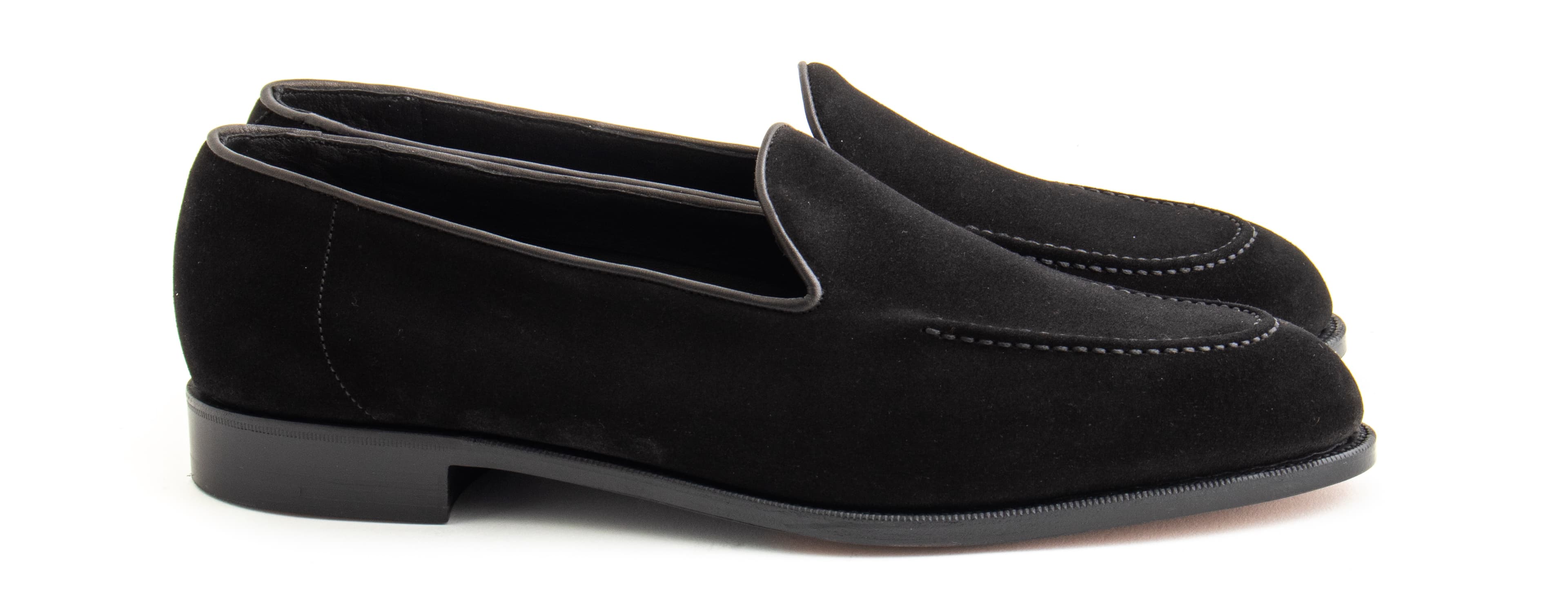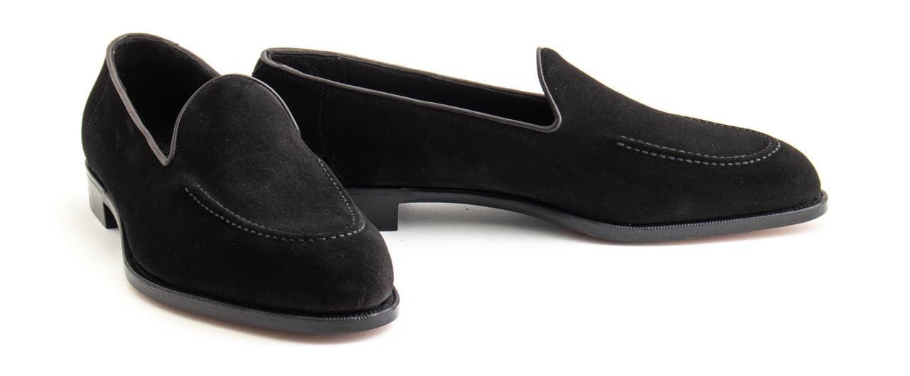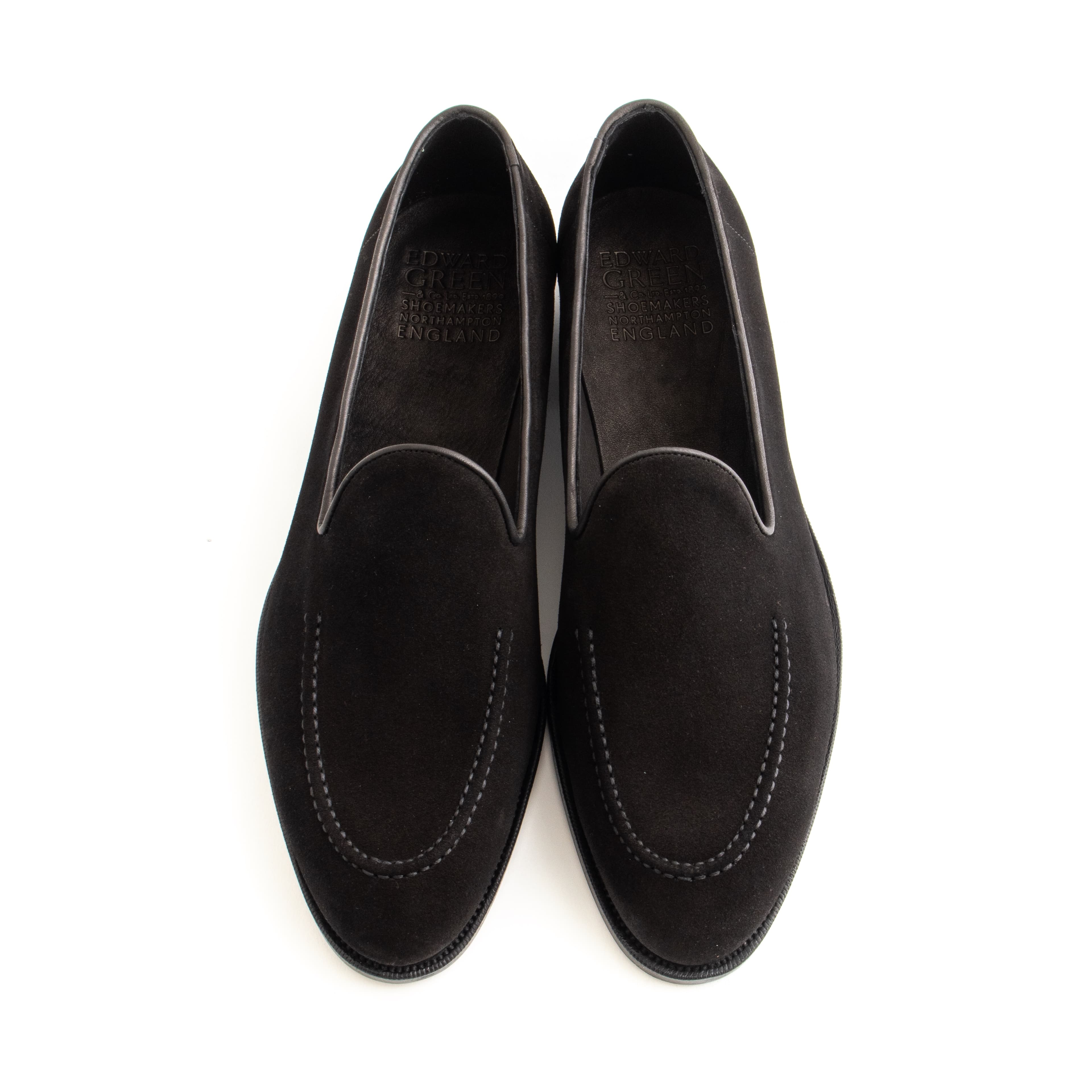 Edward Green’s Hampton is a loafer made with hand sewing along the vamp and toe. We’ve done this pair in unlined black suede for supreme comfort. Your feet will be swaddle by the soft, supple suede.