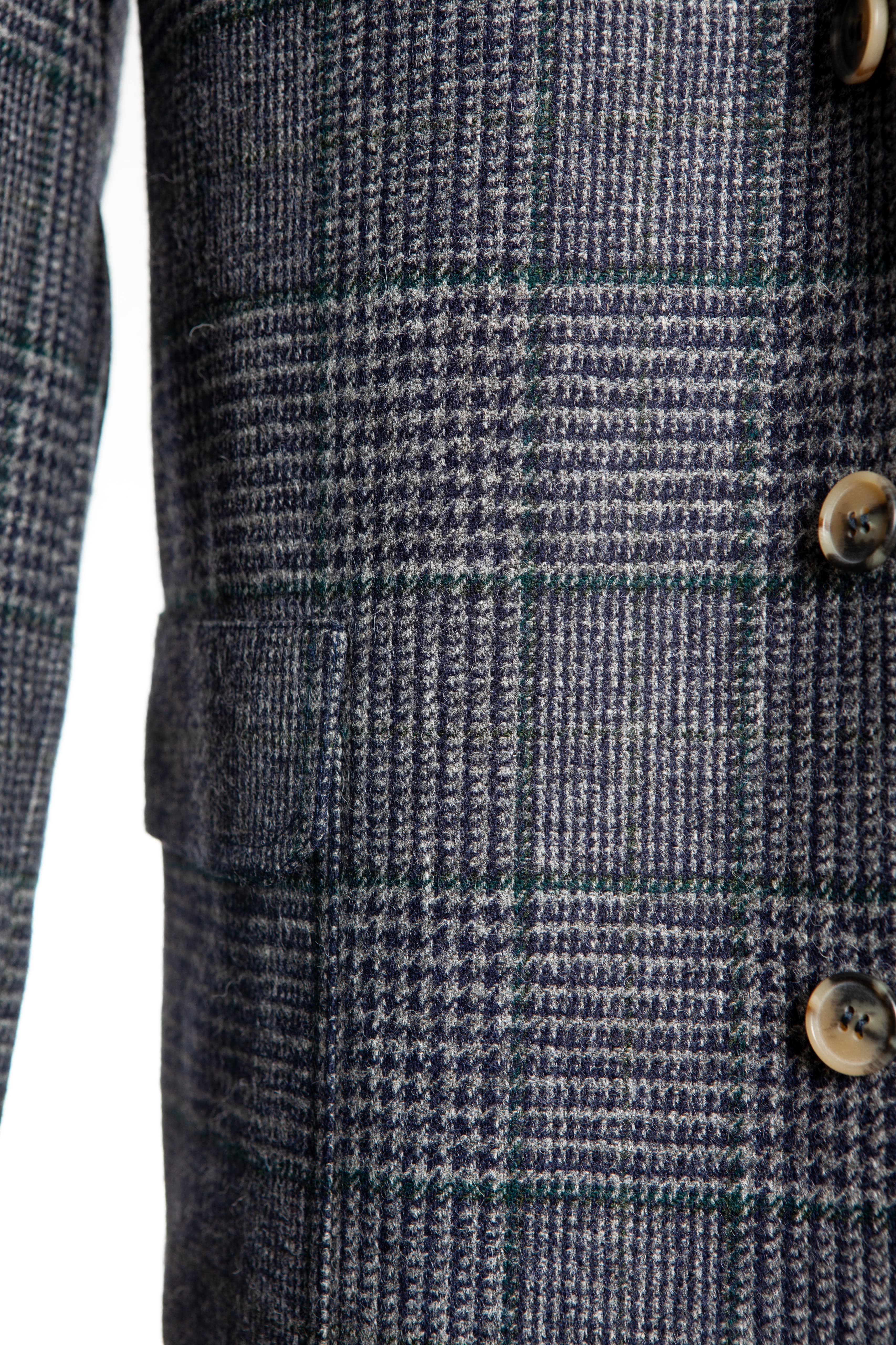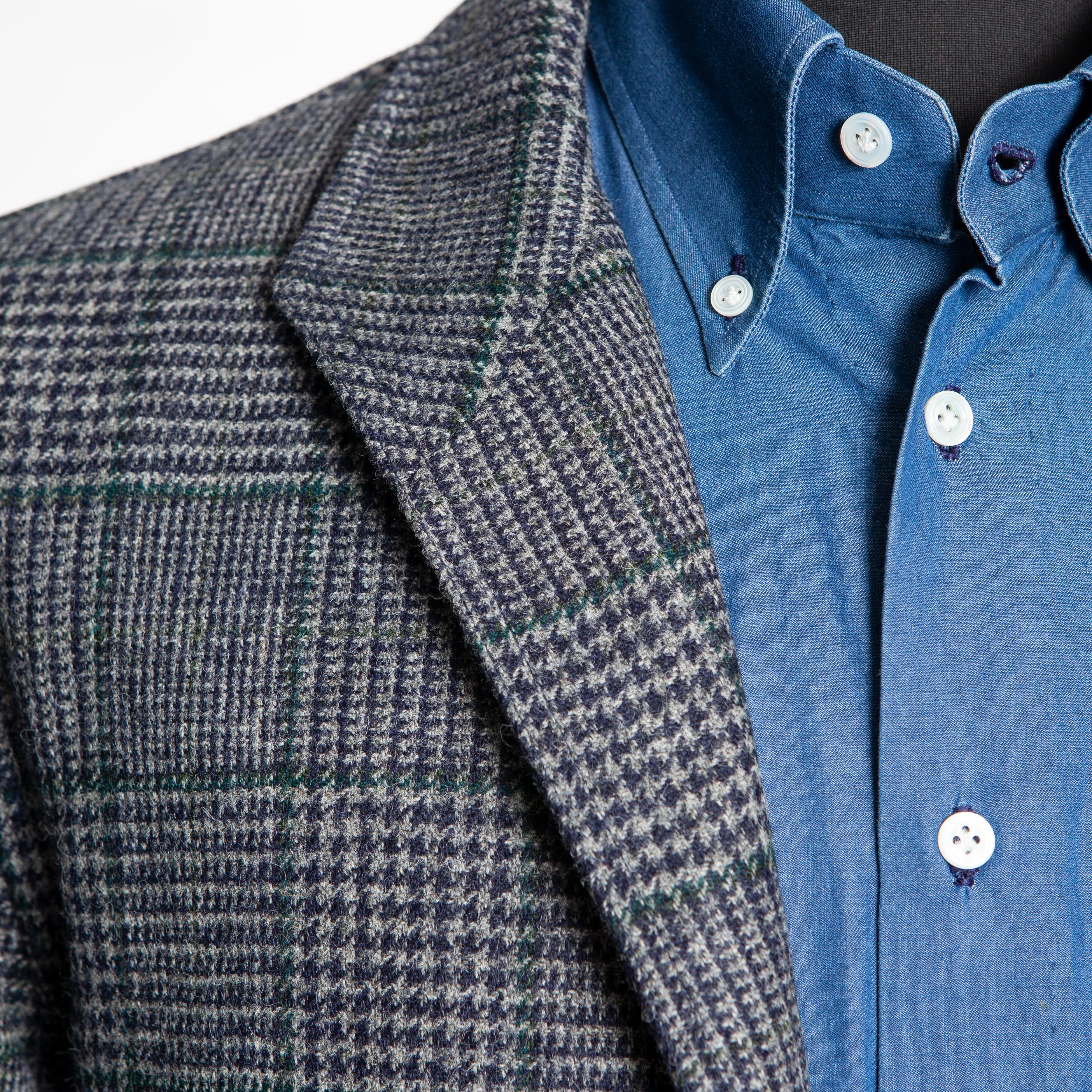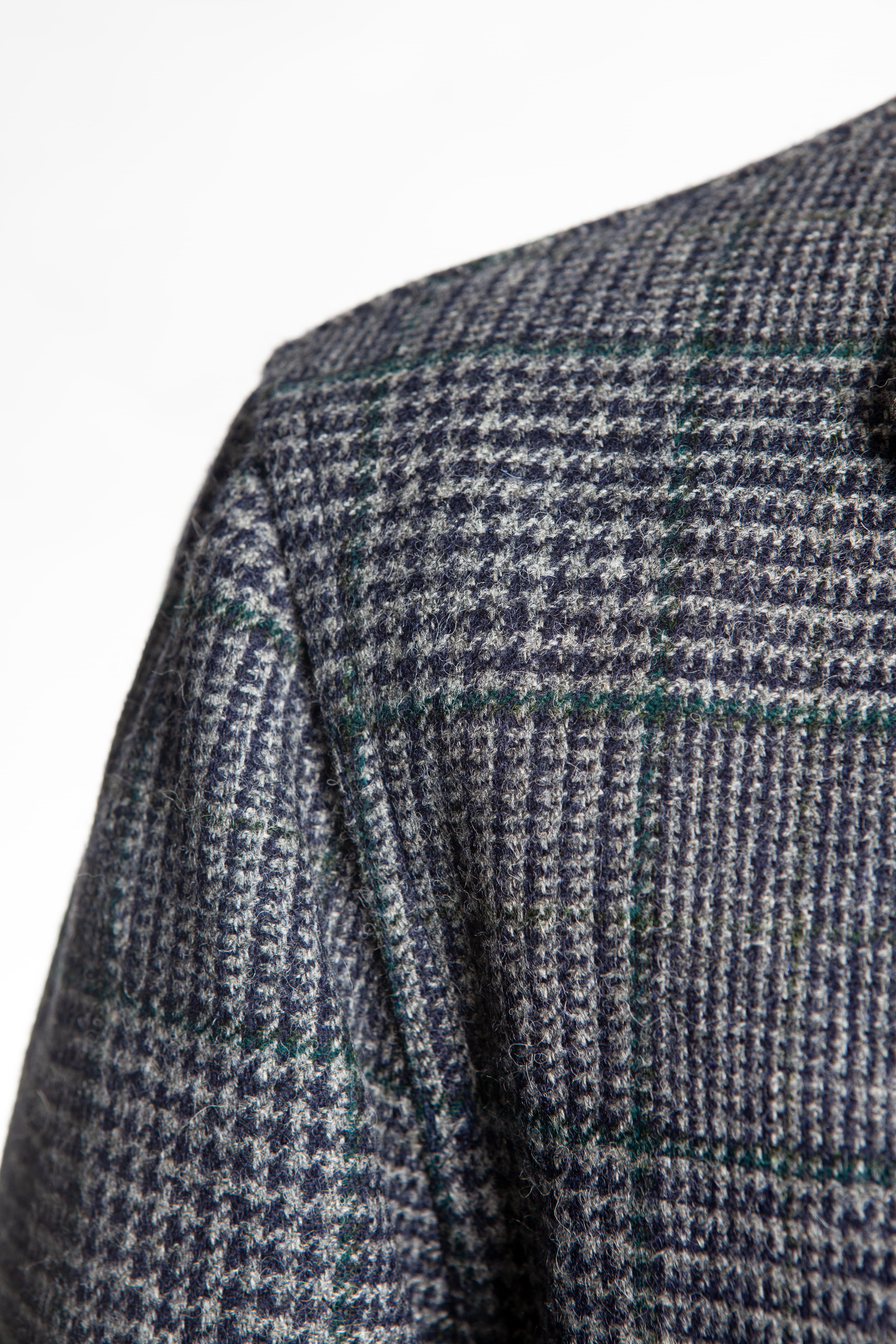 Our Tebas are made in Zaragoza, Spain, by Justo Gimeno from exclusive Fox Brothers tweed. They have four buttons, two flap patch pockets, a single patch breast pocket, and no vent.