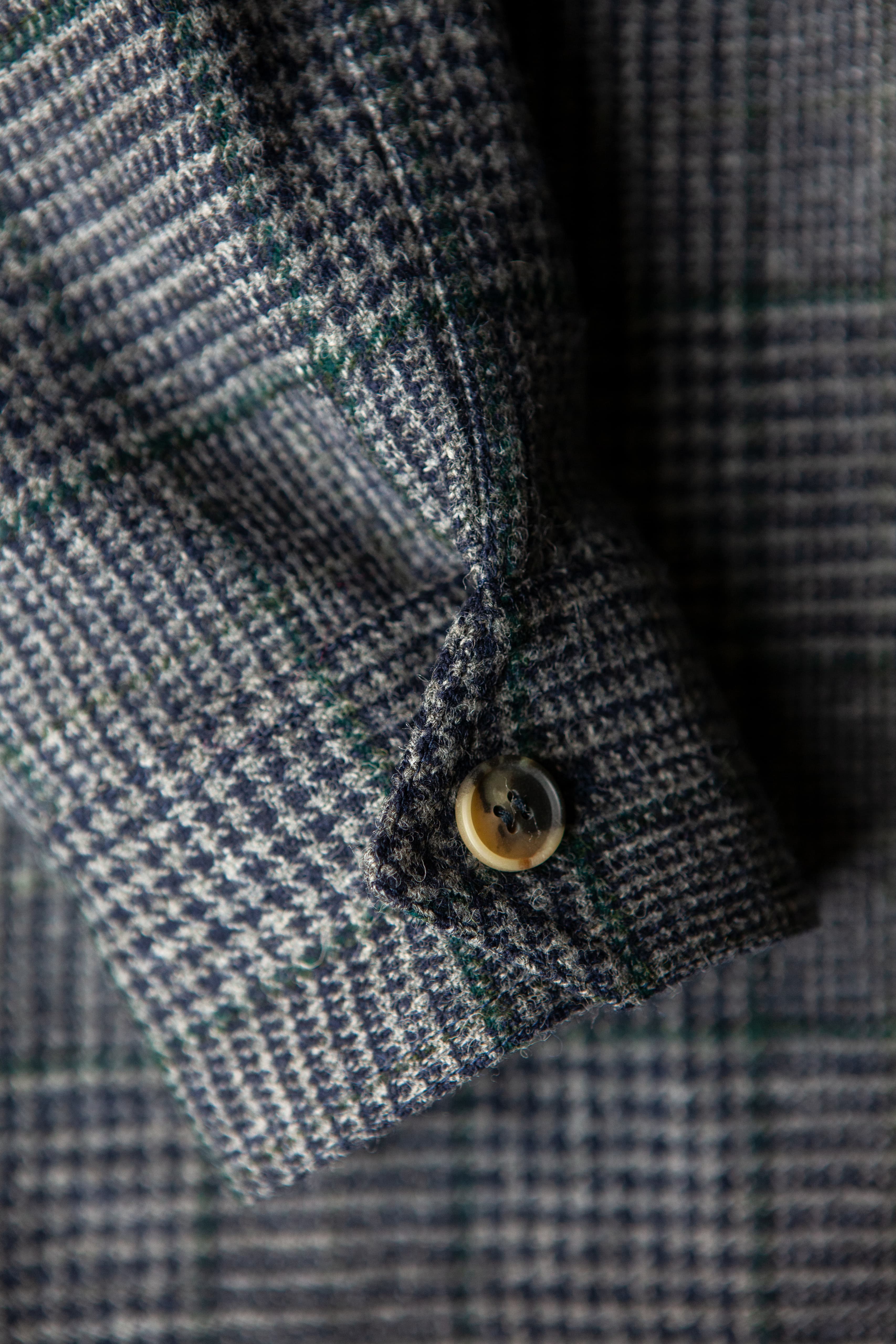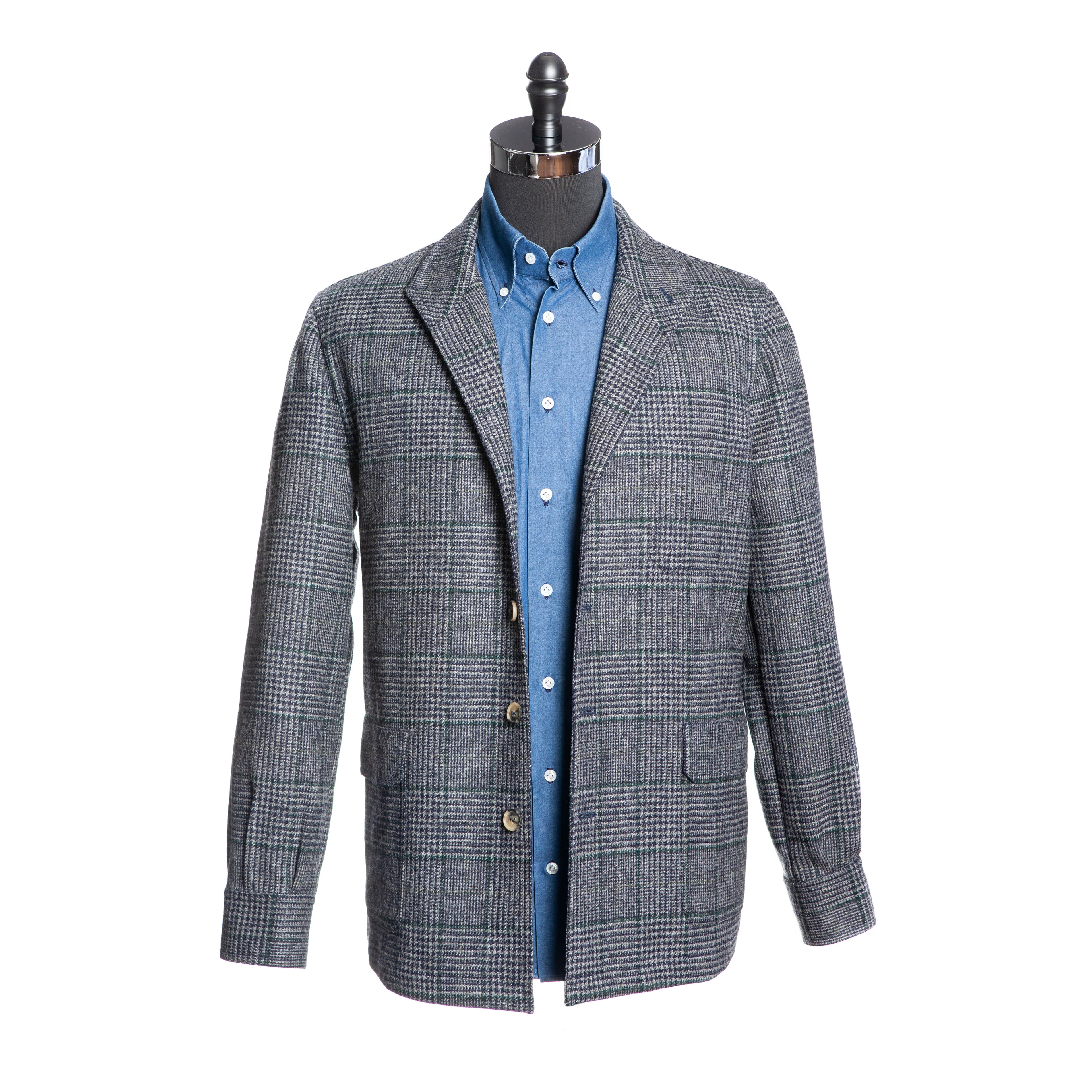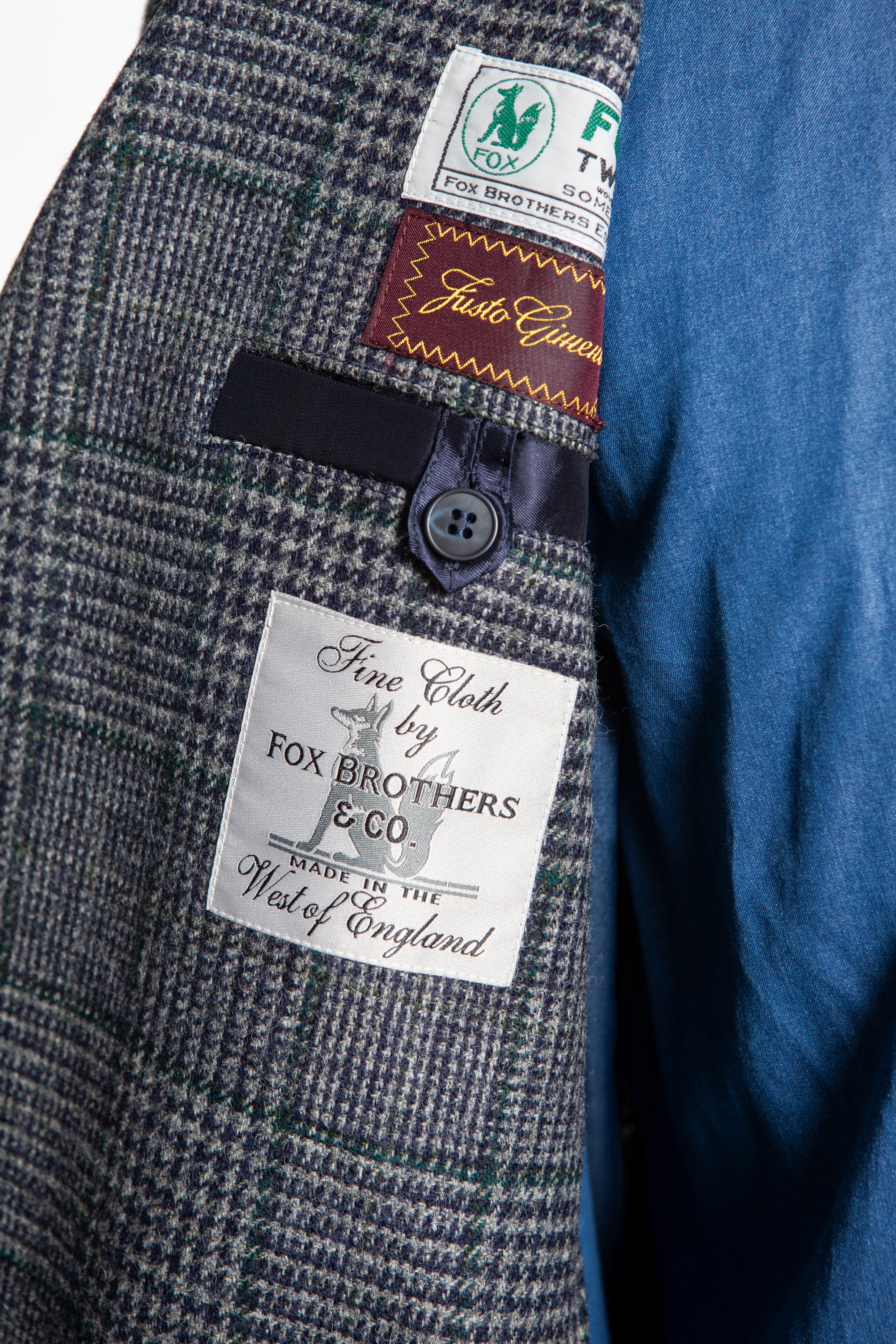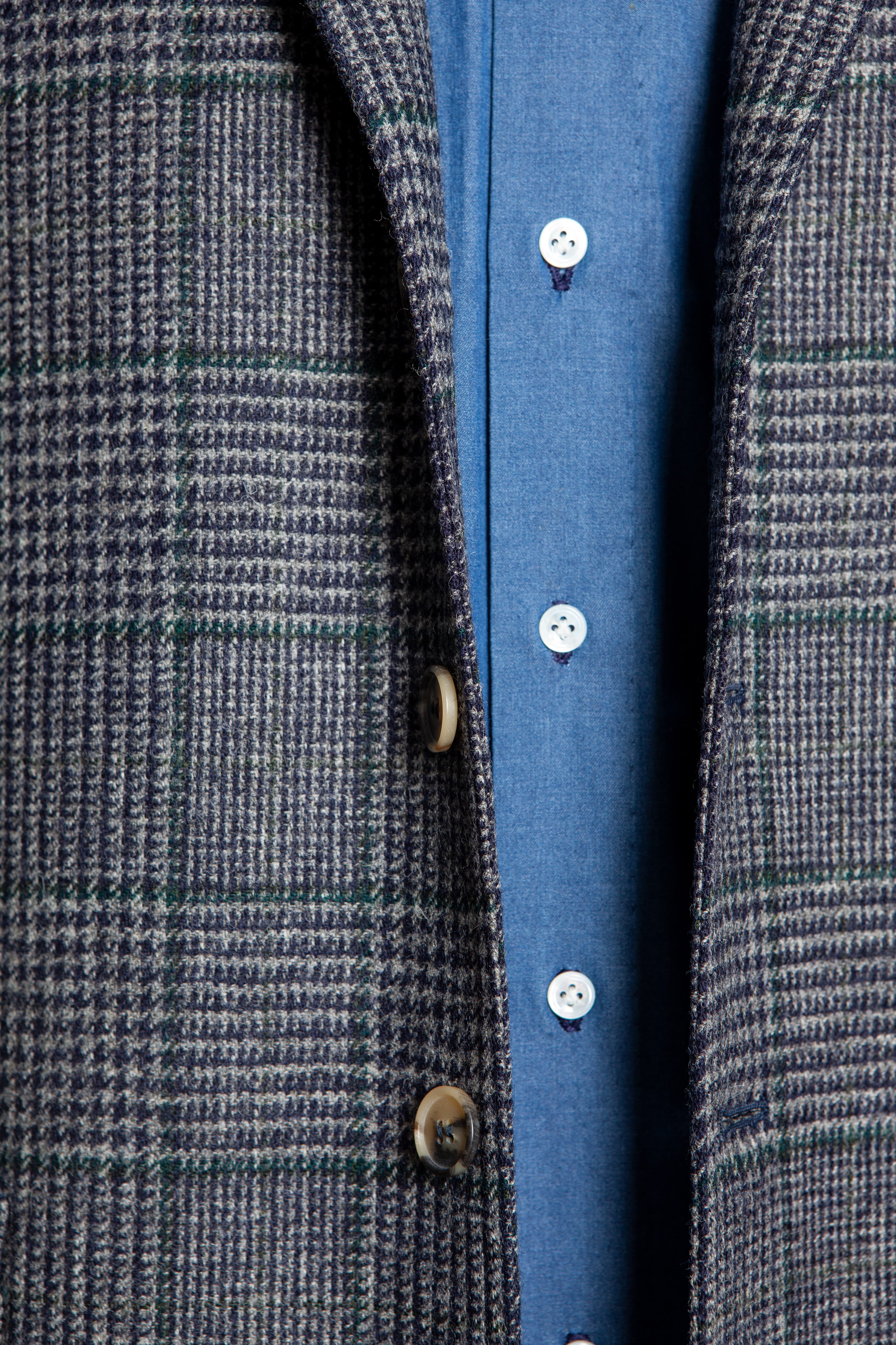 Our Tebas are made in Zaragoza, Spain, by Justo Gimeno from exclusive Fox Brothers tweed. They have four buttons, two flap patch pockets, a single patch breast pocket, and no vent.