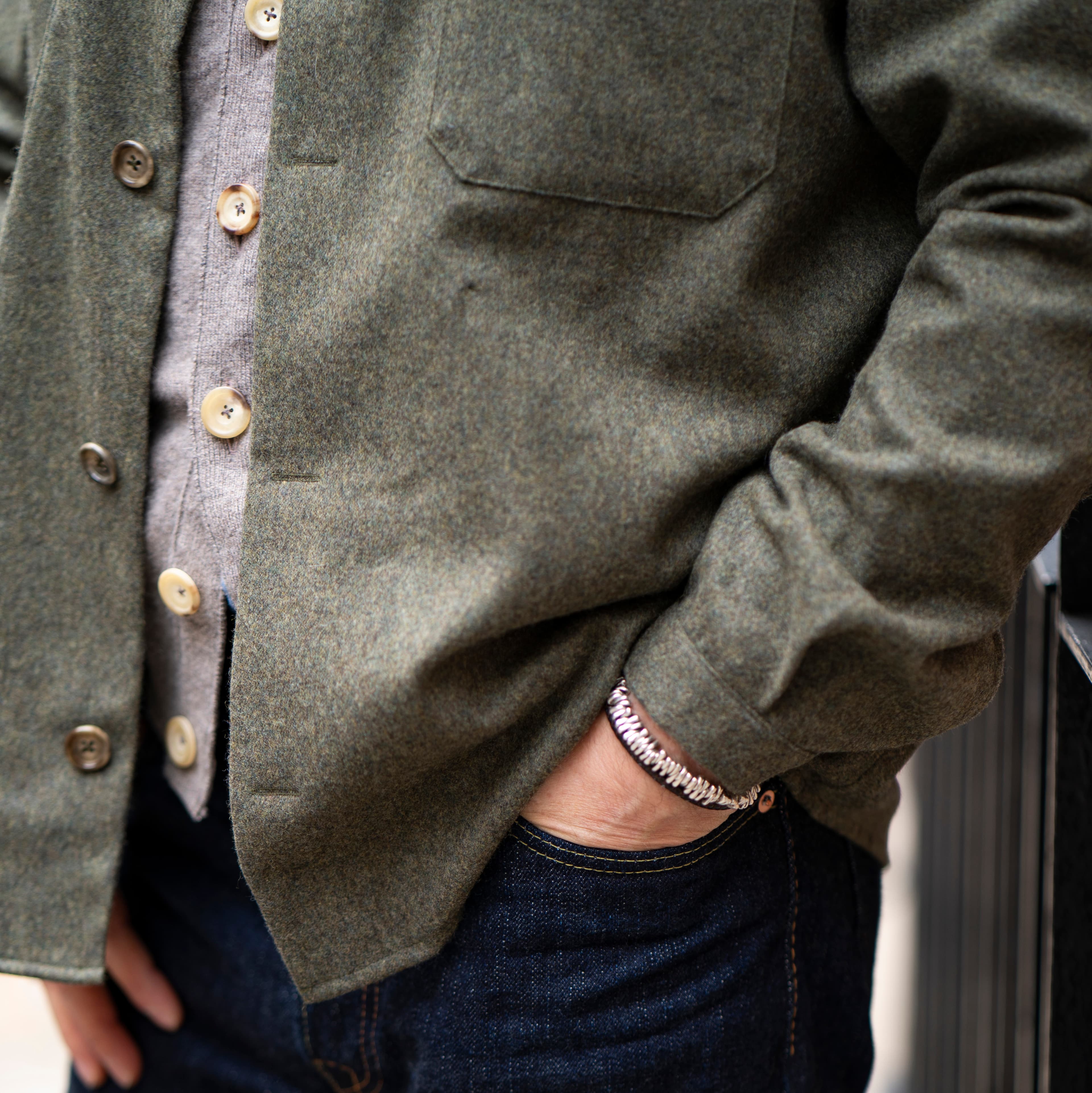 Gianluca Migliarotti writes of the flannel: “From afar it’s green, but on closer inspection the flannel reveals an incredible melange of hidden colours. It reminds me of Alessandro’s Vesper Martini with all its special ingredients so well mixed.”