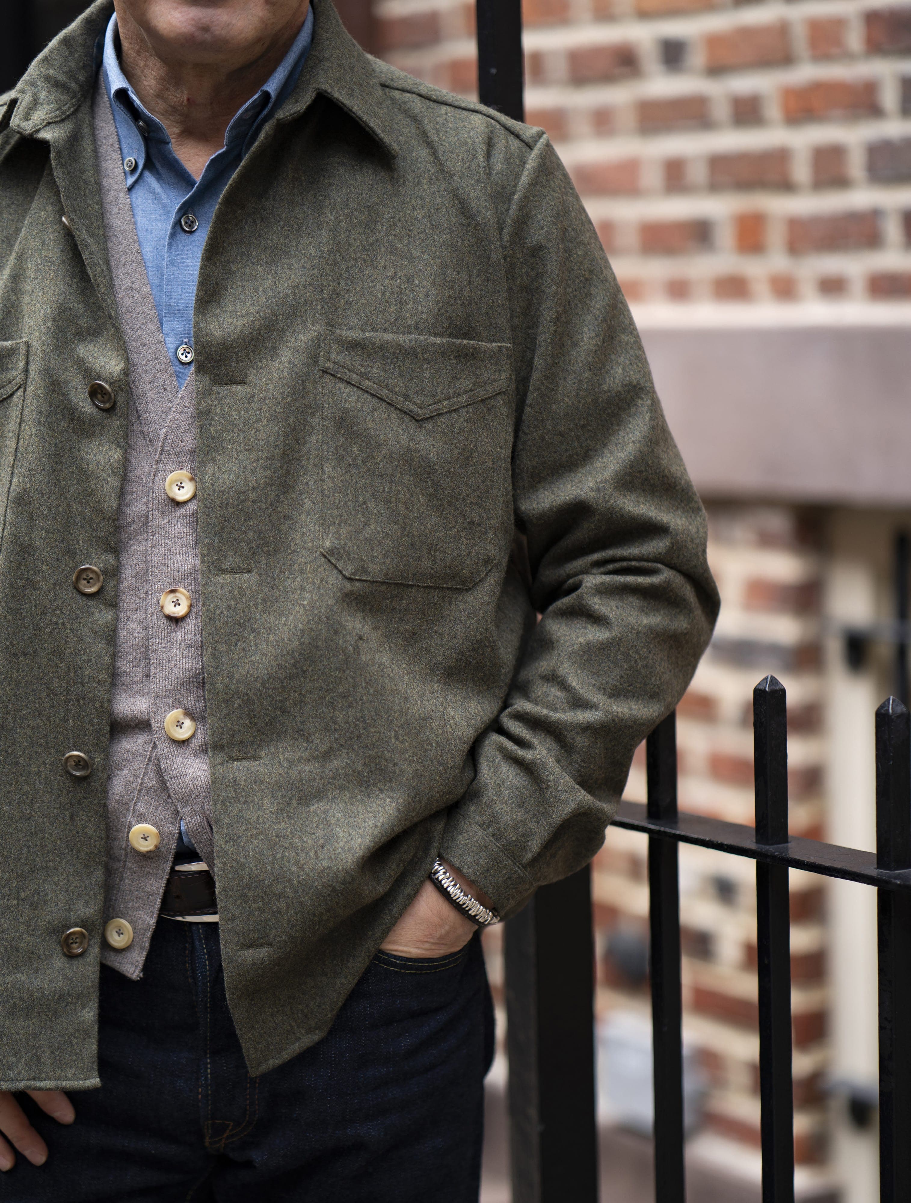 This overshirt is made from Palazzi flannel, which is crafted by Fox Bros. exclusively for PML. It features two chest pockets, a button front, and a single button at each cuff.