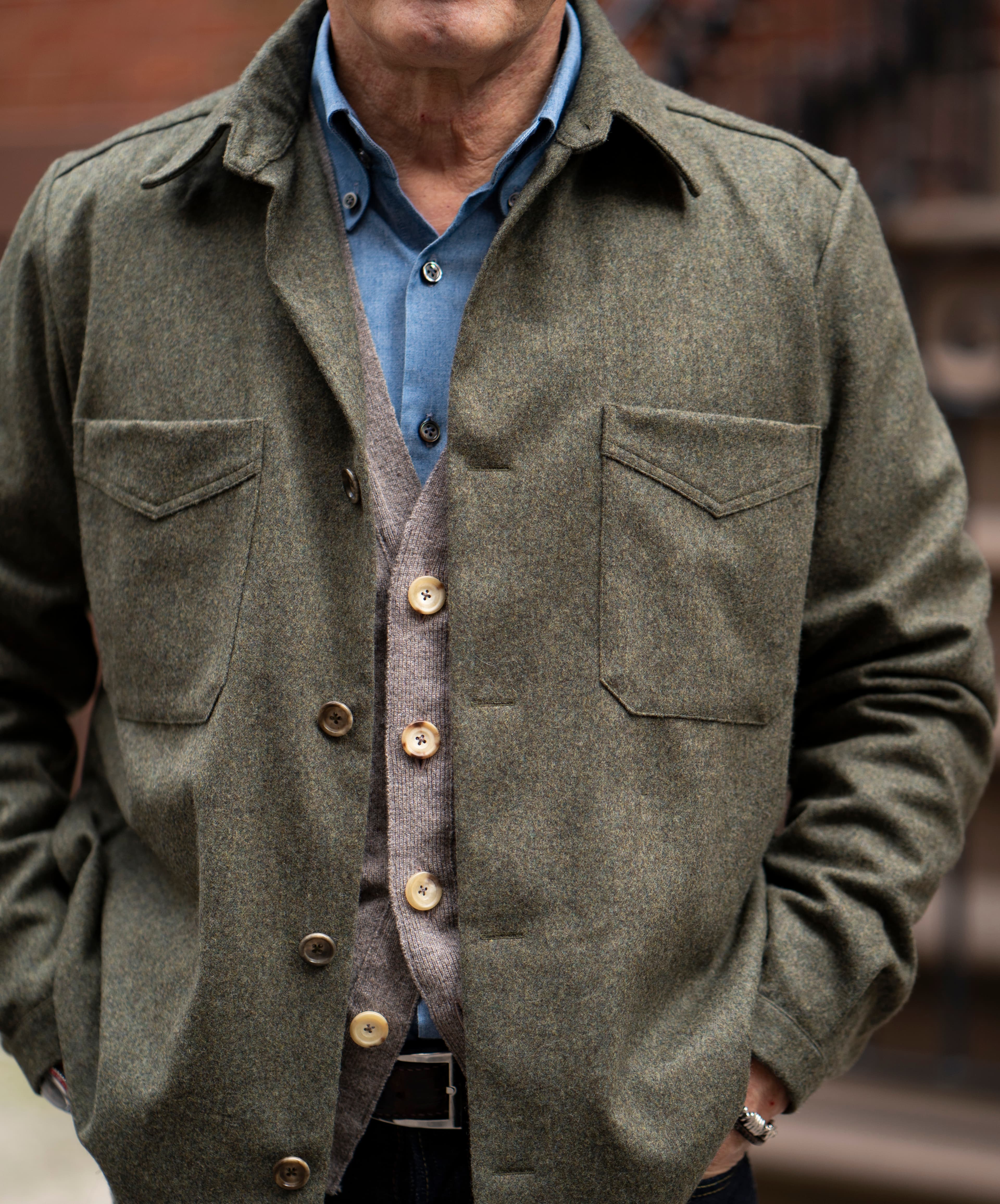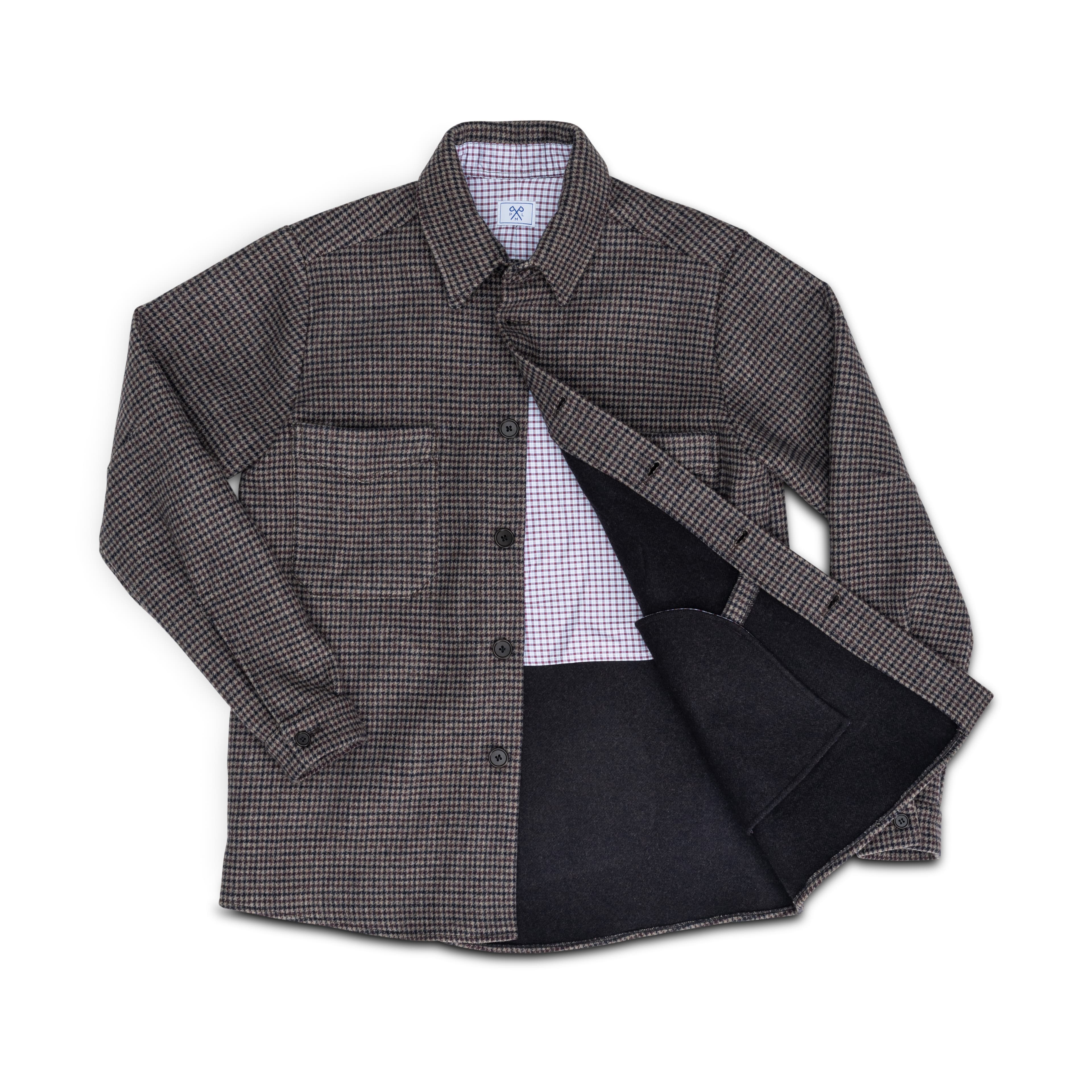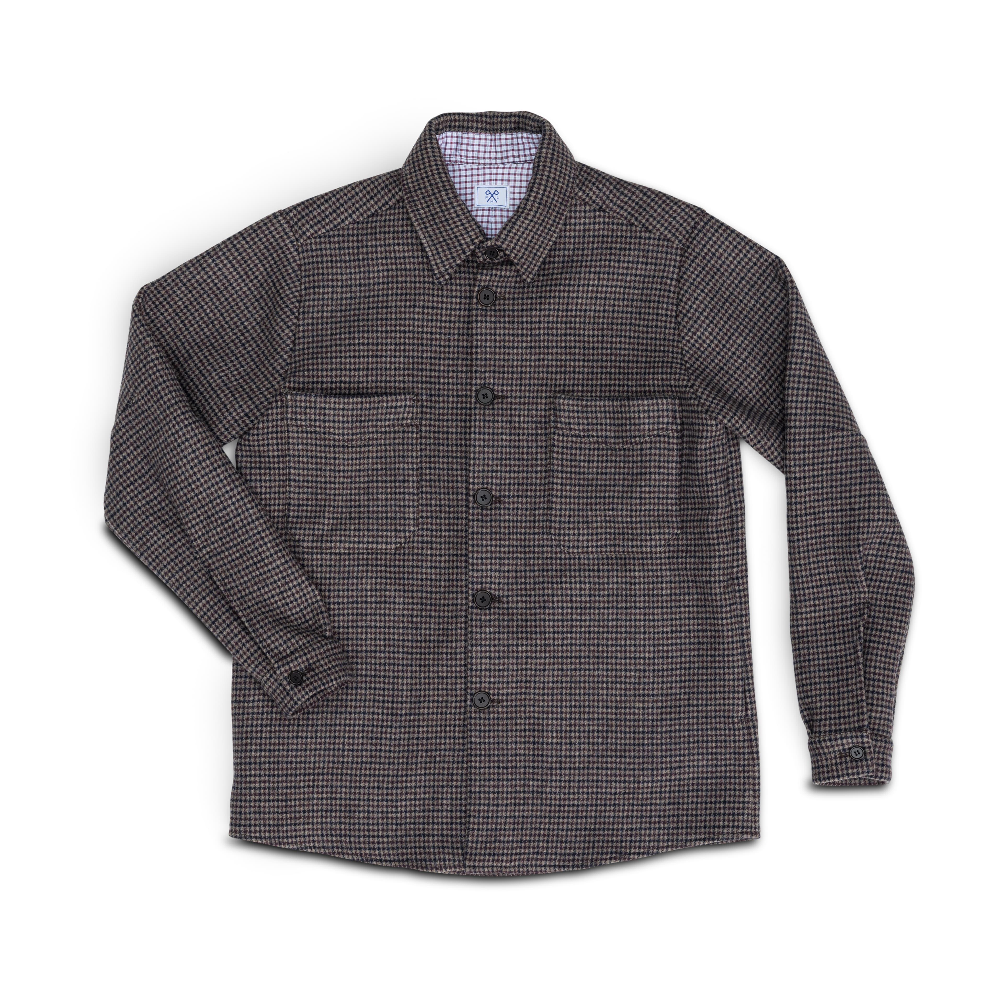 This overshirt is made from a dense VBC two-face houndstooth that’s perfect for winter. It features two chest pockets, two hip pockets, and corozo buttons.