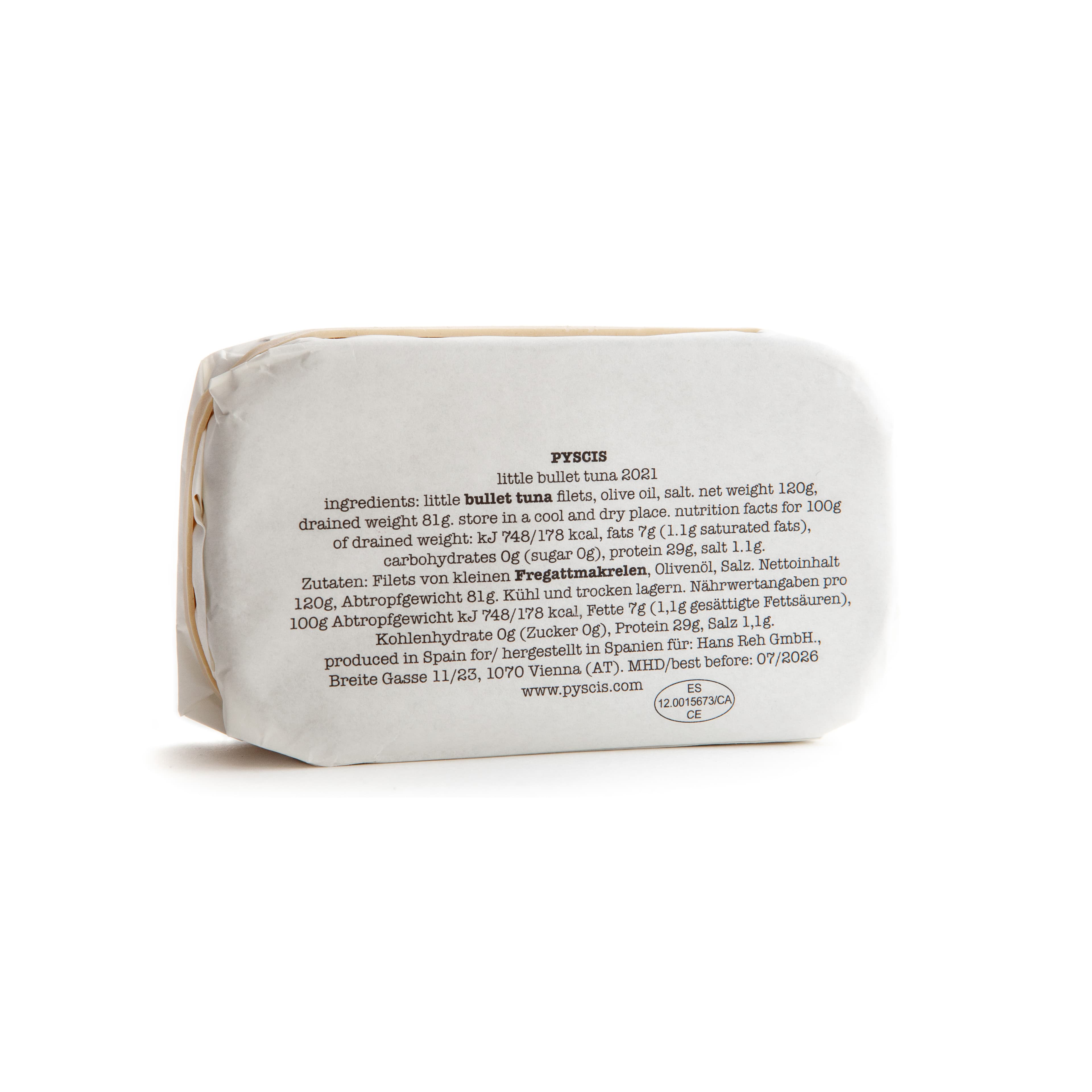 - Ingredients: young bullet tuna (2021) filets in olive oil, salt