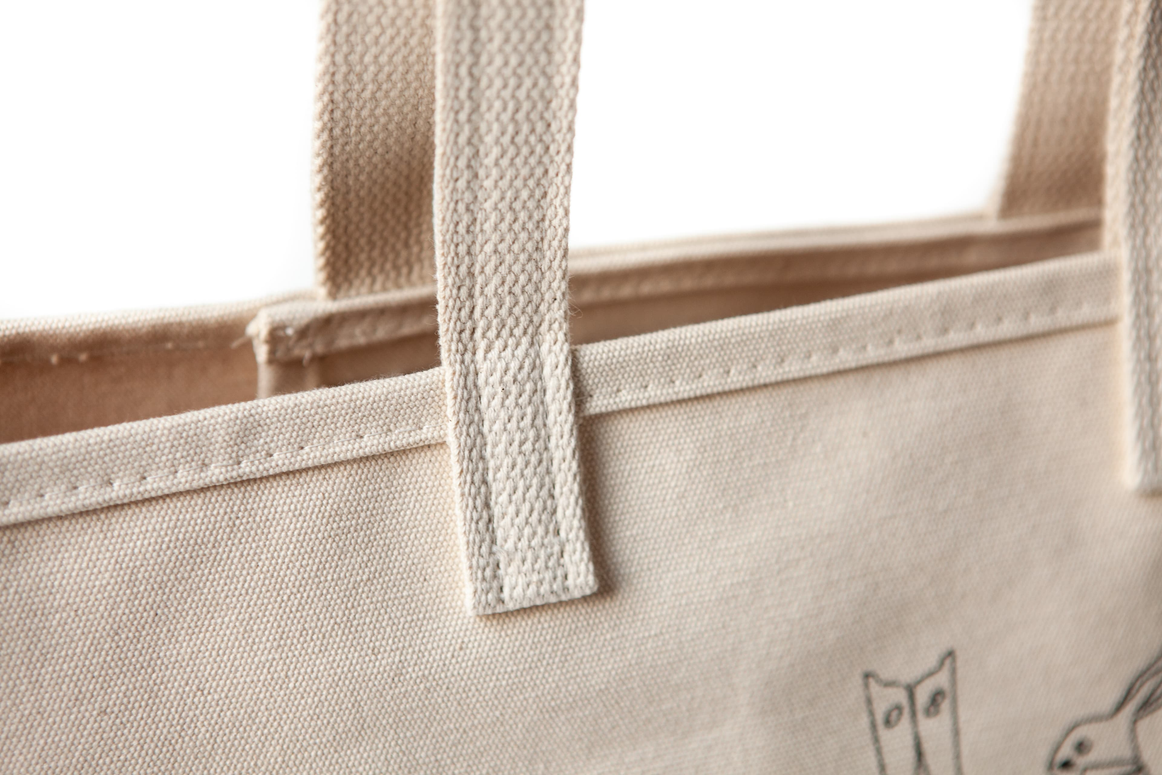 This natural canvas tote bag is made in the USA by Steele Canvas Basket Corp. It has reinforced handles and a boxed bottom, which allows it to stand upright for easy filling. It has an inside pocket to keep small items safe.